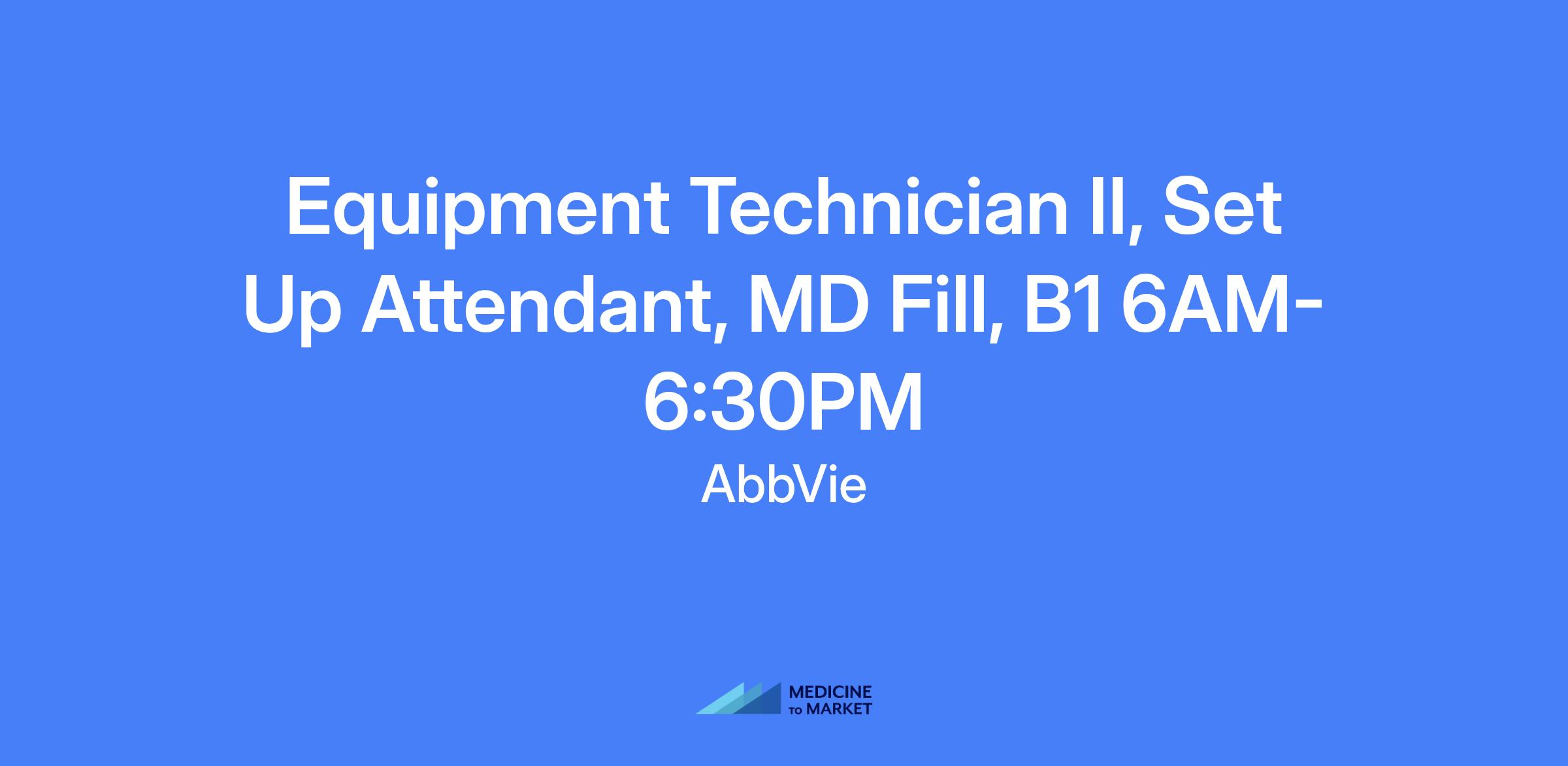 Equipment Technician II, Set Up Attendant, MD Fill, B1 6AM-6:30PM. Responsible for the preparation and/or operation of various components, materials, equipment, machines in the assigned area(s). Performs tasks in accordance with GMPs and department SOPs to maintain product integrity and quality standards. This role is on the B1 Shift: 6AM-6:30PM Thursday/Friday/Saturday & every other Wednesday.