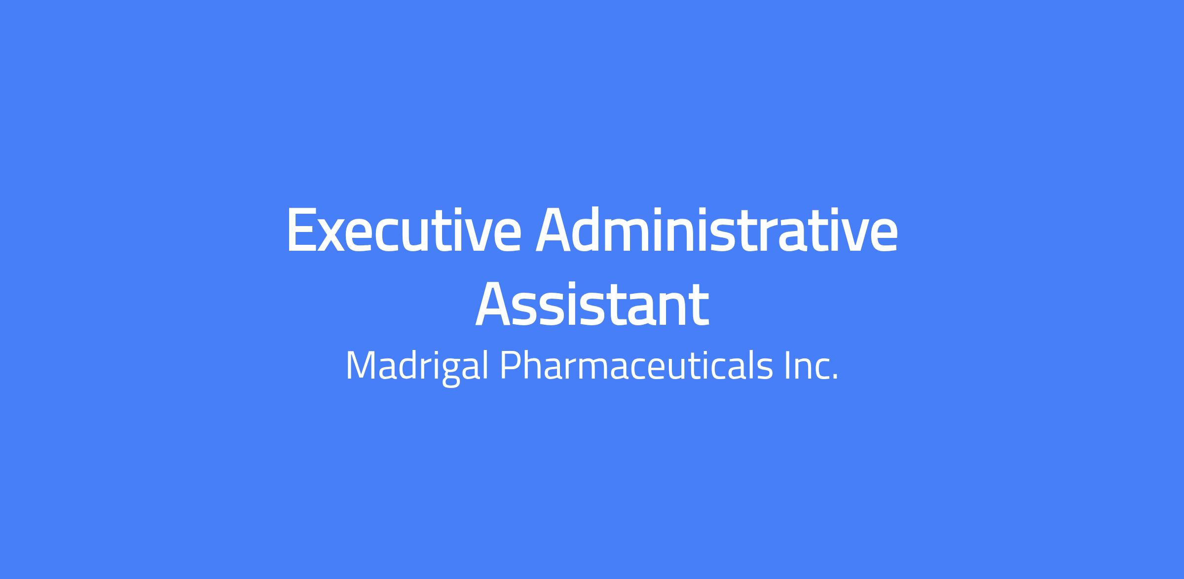 Madrigal is a biopharmaceutical company focused on delivering novel therapeutics for metabolic dysfunction-associated steatohepatitis (MASH), a serious liver disease that can progress to cirrhosis, liver failure, need for liver transplantation and premature mortality. Every member of our Madrigal team is connected by our shared purpose: leading the fight against MASH. Madrigal’s medication, Rezdiffra (resmetirom), is a once-daily, oral, liver-directed THR-β agonist designed to target key underlying causes of MASH. Rezdiffra is the first and only medication approved by both the FDA and European Commission for the treatment of MASH with moderate to advanced fibrosis (F2 to F3). An ongoing Phase 3 outcomes trial is evaluating Rezdiffra for the treatment of compensated MASH cirrhosis (F4c). Our success is driven by our people. We are building a dynamic, inclusive, and high-performing culture that values scientific excellence, operational rigor, and collaboration. To support our continued growth, we are strengthening our workforce strategy to ensure we have the right talent, at the right time, in the right way. The Executive Administrative Assistant provides high-level, strategic administrative and operational support to the Chief Financial Officer (CFO) and Chief Business Officer (CBO). This role serves as a trusted partner to their executive leaders, ensuring seamless operational execution, proactive prioritization, and exceptional coordination across Finance and Business Development, and cross collaboration with all other departments. This is a highly visible role requiring executive presence, sound judgment, discretion, and the ability to anticipate needs in a fast-paced, growth-oriented biotech environment. The ideal candidate operates with a strategic mindset, demonstrates exceptional organizational agility, and thrives in managing complex, shifting priorities while maintaining absolute confidentiality. This role is empowered to act as an extension of executive leadership, representing their interests and making informed decisions on their behalf as appropriate. This position is based in the Waltham, MA office, requiring onsite presence at least three days per week. Key Responsibilities: Executive Calendar, Time & Priority Management Strategically maintain complex calendars and schedules for executive leadership Proactively anticipate conflicts, recommend tradeoffs, and protect executive focus Executive Partnership & Stakeholder Liaison Serve as a primary liaison between executives and internal/external stakeholders Represent executive leadership with professionalism, discretion, and sound judgment Travel, Expense & Administrative Operations Coordinate and proactively monitor end-to-end executive travel, providing real-time support to resolve delays, disruptions, or logistical challenges while minimizing impact to executive schedules Develop detailed travel itineraries and contingency plans aligned with executive priorities and business needs Manage and reconcile executive expenses with accuracy, timeliness, and adherence to company policies and compliance requirements Leadership Team Enablement & Operational Execution Coordinate leadership team meetings, agendas, and follow‑up on key actions and deliverables Provide high‑level administrative and operational support critical to leadership effectiveness Develop and maintain efficient systems for information, documents, and workflows Cross‑Functional Leadership, Projects & Mentorship Lead or support cross‑functional projects and operational initiatives Partner with and support the broader administrative team to ensure continuity and coverage Serve as a mentor and informal leader to the broader administrative staff Confidentiality, Judgment & Professionalism Handle sensitive information with the highest level of confidentiality and professionalism Travel Requirement Some travel is required for team offsite meetings, to the Conshohocken PA office, and potentially other meetings such as Executive Leadership Team offsites, Board of Directors meetings, etc. Required Qualifications: 10+ years of progressive administrative experience, including direct support of C-level executives Proven ability to manage complex schedules, shifting priorities, and high‑visibility work Strong judgment, executive presence, and stakeholder management skills Highly organized, proactive, and solutions‑oriented Advanced proficiency in Microsoft Office Suite (Outlook, PowerPoint, Word, Excel, Teams, SharePoint) Desired Qualifications: Bachelor’s degree preferred Prior experience in a biotech, pharmaceutical, and/or publicly traded company strongly preferred Experience supporting finance, business development, or other corporate leadership functions Madrigal’s Total Rewards strategy is based on a biotech industry peer group comparator and is inclusive of base pay, bonus and equity. Our equity offers meaningful opportunity allowing our employees to share in the success they help create. By aligning individual and company performance, we empower employees to think like owners, giving them a stake in the organization. All employees receive equity, which we believe reinforces our ownership culture. Base salary is determined by several factors including the candidate’s qualifications, skills, education, experience, business needs and market demands. As of the date of this posting, a good faith estimate of the current pay scale for this position, applicable to all candidates, is $104,000 - $127,000 per year. We comply with all applicable minimum wage laws. All full-time employees receive equity, which reinforces our ownership culture and offers meaningful opportunity for our employees to share in the success they help create. By aligning individual and company performance, we empower employees to think like owners, giving them a stake in the organization. Full-time employees are also eligible for comprehensive benefits, including flexible paid time off, 