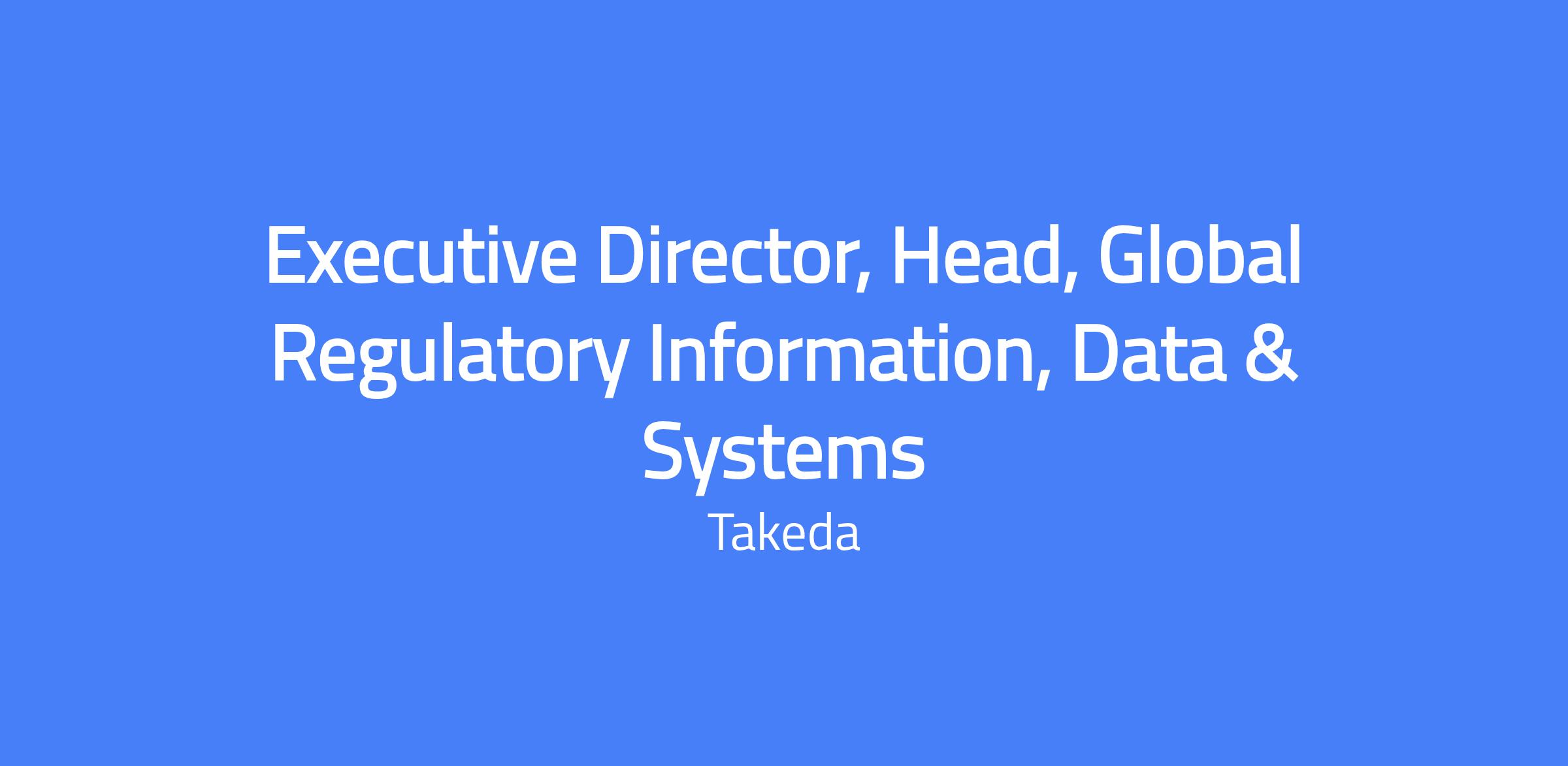 Executive Director, Head, Global Regulatory Information, Data & Systems (GRIDS) at Takeda. Reporting to the Head of Global Regulatory Operations, this role is responsible for developing and implementing a comprehensive GRIDS strategy to ensure regulatory data integrity and drive adoption and efficiency of Regulatory systems globally. The role includes guiding and mentoring a team, improving regulatory data quality, achieving global system reach and adoption, and enhancing efficiency through data connectivity across Global Regulatory Affairs, R&D, and the enterprise. It also leads accurate and timely reporting for both common and ad hoc regulatory affairs questions. Location: Boston, MA.