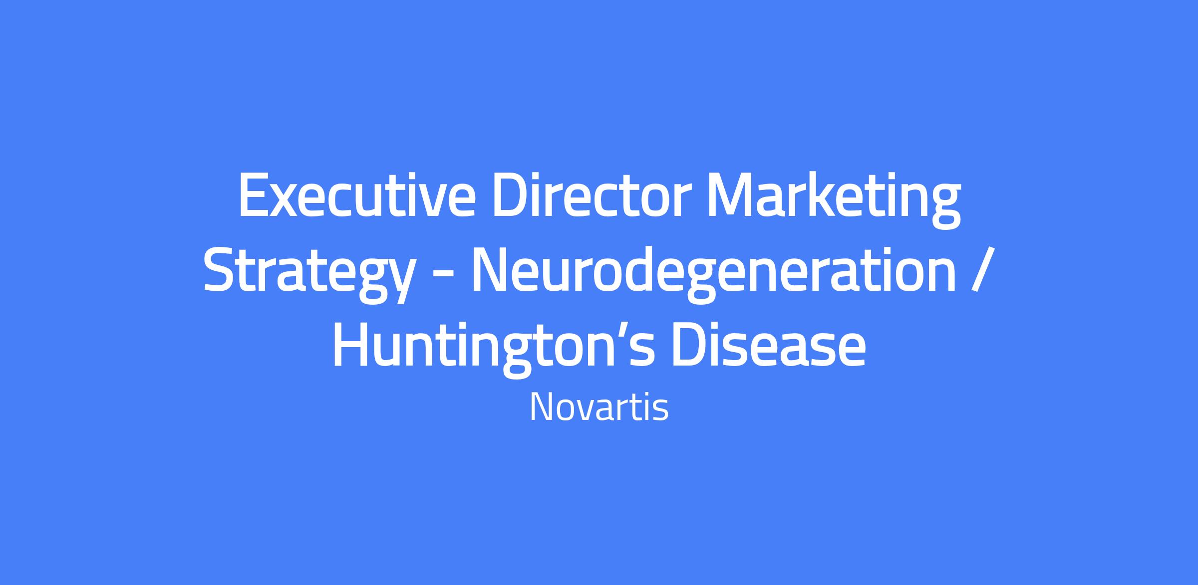 Executive Director, Marketing Strategy for Neurodegeneration / Huntington’s Disease. Location: East Hanover; remote work not available. Travel expected: 20% (domestic and international). Responsible for leading and managing the full spectrum of marketing for brand(s) or brand indication(s), including marketing strategy, analysis, budget and resource management with multiple global, regional and country stakeholder relationships. Contributes to the development and execution of the strategic business plan, tactical program development, implementation, and ROI assessment.