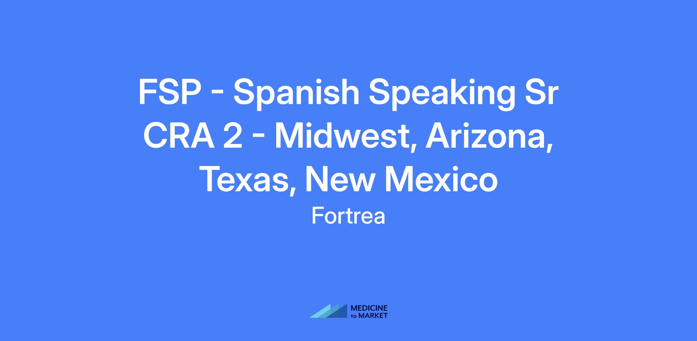 FSP - Spanish Speaking Sr CRA 2 - Midwest, Arizona, Texas, New Mexico. Experienced Sr. CRAs fluent in Spanish, residing in the Midwest US or open to hub airports with direct flights to Puerto Rico. This FSP aligned role works with IVD clinical trials.