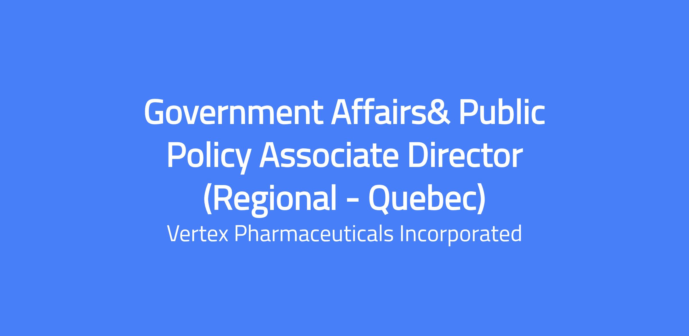 Job Description The Associate Director of Government Affairs & Public Policy is accountable to develop and execute the government relations strategy in Quebec and the Atlantic Provinces. This person will be Vertex Canada's key contact with political decision makers, policy makers and payers within the region and work cross functionally to achieve our corporate objectives. Key Responsibilities: Government Affairs and Public Policy: Develop and execute Vertexâs government relations strategy at the provincial level in order to achieve timely access to approved Vertex medicines and support a competitive Life Science ecosystem Cultivate and maintain productive relationships with government officials (e.g., provincial legislators, ministerial/legislative assistants, civil servants, etc.). Serve as the primary contact point for governmental relations to discuss public policy, and corporate priorities. Organize and coordinate government-related activities, such as meetings and visits and represent Vertex at relevant external events, conferences and governmental consultations Assess the impact of relevant legislation, regulations and public policy on the business and patient access to innovative new medicines. Provide strategic advice, develop and execute tactics to seize opportunities or mitigate risks. Participate in industry working groups regarding public policy initiatives relevant to Vertexâs business, like rare diseases, cell and gene and other Life Sciences relevant topics. Stakeholder Communities: In collaboration with Corporate Communications, develop stakeholder communications strategies, including disease awareness campaigns Assist in developing communications products such as key messaging and talking points/Q&A to articulate Vertex's value proposition, importance of timely access to approved medicines and policy positions for use during interactions with external stakeholders Develop and implement appropriate issues management and crisis communications plans as required. Key Requirements: Bachelorâs degree in political science, communications, business administration or a related field Experience working at a senior level in government relations, communications, or other relevant roles Demonstrated experience working directly with government stakeholders at both the political and civil service levels and navigating a complex and bilingual environment Experience in people and vendor management Experience working in a biotech/pharmaceutical company, in the government or in the health care system/industry Sound knowledge of public policy and government structures within assigned regions Experience working in corporate communications or market access with the good understanding of rare diseases Understanding of the legal, regulatory, and compliance environment and commitment to adhere to high ethical standards Excellent interpersonal skills, with strong written and verbal communication abilities, and demonstrated capacity to work effectively with all levels and functions in a very fast-paced environment Bilingual fluency in both French and English. Disclosure Statement: This position is exempt from the compensation disclosure requirements under applicable law. At Vertex, our Total Rewards offerings also include inclusive market-leading benefits to meet our employees wherever they are in their career, financial, family and wellbeing journey while providing flexibility and resources to support their growth and aspirations. From medical, dental and vision benefits to generous paid time off (including a week-long company shutdown in the Summer and the Winter), educational assistance programs including student loan repayment, a generous commuting subsidy, matching charitable donations, retirement and so much more. This recruitment process may involve the use of artificial intelligence (AI) to assist in screening and assessing applications. AI may be used at various stages to support decision-making, including reviewing resumes and evaluating qualifications. If you have any questions about how AI is used in this process, please contact ApplicationAssistance@vrtx.com. Le ou la directeur·trice associé·e des affaires gouvernementales et des politiques publiques est responsable de lâélaboration et de la mise en Åuvre de la stratégie de relations gouvernementales au Québec et dans les provinces de lâAtlantique. Cette personne sera le principal point de contact de Vertex Canada auprès des décideur·euse·s politiques, des responsables des politiques publiques et des payeurs dans la région, et travaillera de façon transversale afin dâatteindre nos objectifs organisationnels. Principales responsabilités : Affaires gouvernementales et politiques publiques : Ãlaborer et mettre en Åuvre la stratégie de relations gouvernementales de Vertex au niveau provincial afin dâassurer un accès rapide aux médicaments approuvés de Vertex et de soutenir un écosystème concurrentiel des sciences de la vie. Ãtablir et maintenir des relations productives avec les représentant·e·s gouvernementaux·ales (p. ex., législateur·trice·s provinciaux·ales, adjoint·e·s ministériel·le·s ou parlementaires, fonctionnaires, etc.) Agir comme principal point de contact pour les relations gouvernementales afin de discuter des politiques publiques et des priorités organisationnelles. Organiser et coordonner les activités liées au gouvernement, telles que des réunions et des visites, et représenter Vertex lors dâévénements externes pertinents, de conférences et de consultations gouvernementales. Ãvaluer lâincidence des lois, règlements et politiques publiques pertinents sur les activités de lâentreprise et lâaccès des patient·e·s à de nouveaux médicaments innovants. Fournir des conseils stratégiques, élaborer et mettre en Åuvre des tactiques afin de saisir les occasions ou dâatténuer les risques. Participer à des groupes de travail sectoriels portant sur des initiatives de p