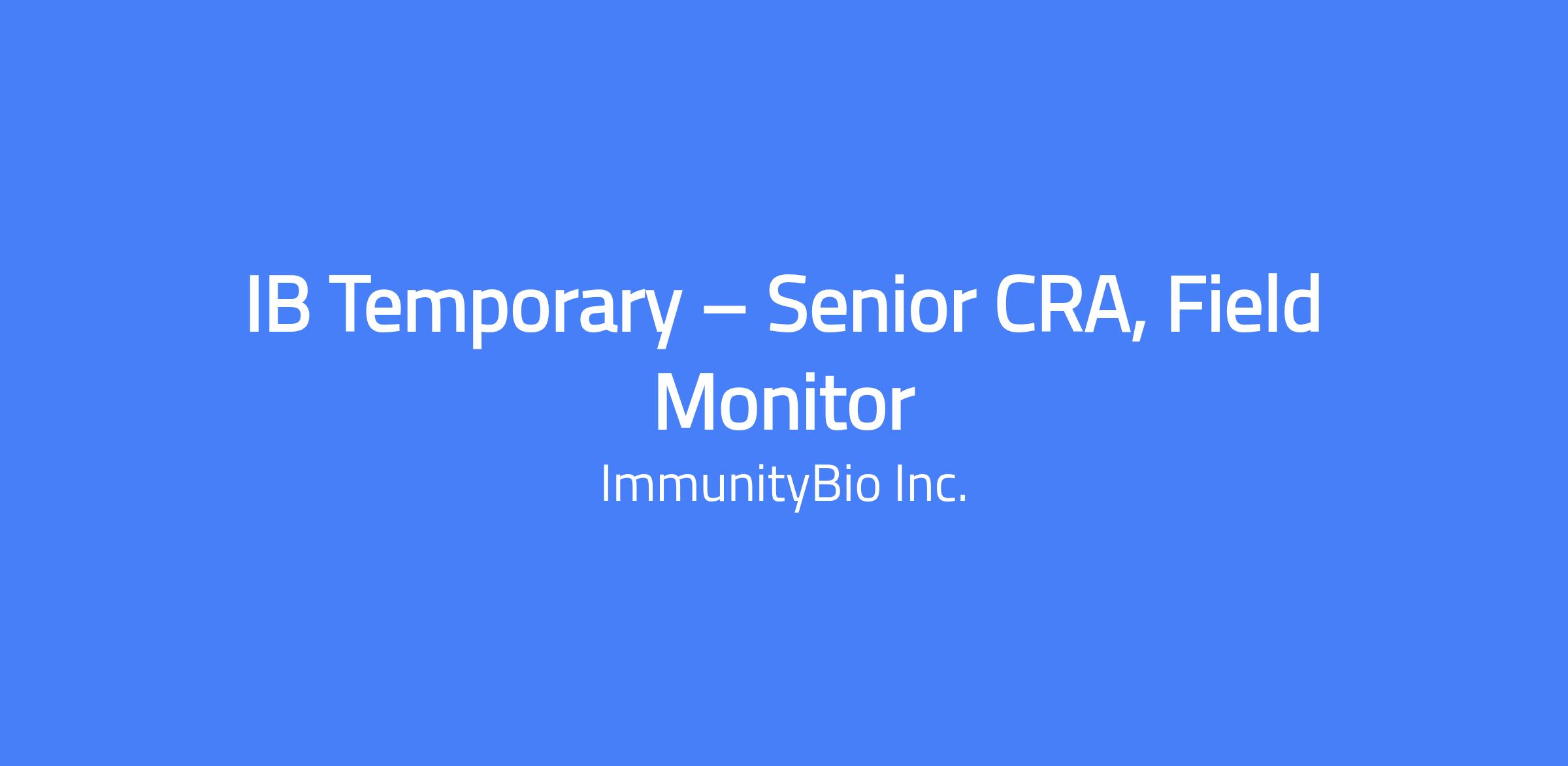 Company Overview ImmunityBio, Inc. (NASDAQ: IBRX) is a commercial-stage biotechnology company developing cell and immunotherapy products that are designed to help strengthen each patientâs natural immune system, potentially enabling it to outsmart the disease and eliminate cancerous or infected cells. We envision a day when we no longer fear cancer, but can conquer it, thanks to the biological wonder that is the human immune system. Our scientists are working to develop novel therapies that harness that inherent power by amplifying both branches of the immune system, attacking cancerous or infected cells today while building immunological memory for tomorrow. The goal: to reprogram the patientâs immune system and treat the host rather than just the disease. Why ImmunityBio? ⢠ImmunityBio is developing cutting-edge technology with the goal to transform the lives of patients with cancer and develop next-generation therapies and vaccines that complement, harness and amplify the immune system to defeat cancers and infectious diseases. ⢠Opportunity to join a publicly traded biopharmaceutical company with headquarters in Southern California. ⢠Work with a collaborative team with the ability to work across different areas of the company. ⢠Ability to join a growing company with professional development opportunities. Position Summary IB Temporary - Senior CRA, Field Monitor will participate in clinical research teams to ensure the most effective and efficient conduct of clinical research studies by providing training, protocol interpretation, document collection and review and overall clinical trial support. Essential Functions Develop, review and update study-related training materials and documents including: site initiation training slides, informed consent form templates, procedures manuals, laboratory and pharmacy manuals Interpret medical and scientific intent of assigned study protocols and study procedures, logistics, risks to research subjects and safety, data evaluation methods etc. Communicate scientific rationale for assigned studies to team members and clinical sites Serve as Subject Matter Expert for clinical sites including providing guidance on protocol interpretation and eligibility requirements Create/edit, distribute and collect site feasibility questionnaires Oversee and support collection of essential documents during study start-up Collect study and site metrics and maintain study trackers, as needed Participate in case report form (CRF) data review and review of source documents, work with sites to resolve data queries as needed Communicate regularly with field and in-house Clinical Research Associates (CRAs) to provide information before and after site visits Partner with field CRAs to resolve issues identified during site visits Work with Supply Chain to ensure sites maintain sufficient investigational product (IP) to properly conduct the trial as well as resolve IP temperature monitoring excursions and train or assist sites with corrective actions Train vendors, investigators, and study coordinators on study requirements and provide guidance on site issues Clinical specimen log review, coordinating shipment of specimens to the sponsor or contracted vendor Conduct remote monitoring tasks including reconciliation of site investigational product accountability, as needed Provide mentorship and training to newly hired research staff. Performs other duties as assigned. Education & Experience Bachelorâs degree in a clinical research, science, or health-related field with 6 years of experience in a clinical research setting required; or High school diploma with 8 years of experience in a clinical research setting required Minimum of 2 yearsâ experience as a Clinical Research Associate II or higher required Knowledge, Skills, & Abilities Proficiency in MS Word, Excel, PowerPoint, Outlook, Adobe Excellent written/oral communication skills as well as strong organizational and multi-tasking skills Strong organizational and multi-tasking skills Understand the job-specific system, processes as defined by the companyâs SOPs, and adhere to the requirements listed in those documents. If any of the procedure or process requirements are unclear or ambiguous, it is the responsibility of the employee to notify his/her supervisor or manager. Maintain corporate confidentiality at all times Ability to set priorities and independent decision making Ability to work independently as well as in teams Ability to discover issues, provides solutions and provides guidance to in-house team on how to address issues Strong oral and written communication skills Outgoing and confident demeanor Independent thinker and persuasive communicator Detail oriented, with solid organization and time management skills Completes projects with reliability and minimal guidance Knowledge of drug development process Computer literacy: EDC, eTMF, CTMS, etc. Working knowledge of ICH E6, and the Code of Federal Regulations Working Environment / Physical Environment Must be able to travel up to 75% of the time based on study requirements Remote with ability to work flexible hours for various time zones The specific rate will depend on the successful candidateâs qualifications, prior experience as well as geographic location. National Market (all markets unless identified as Premium) $61.54 (entry-level qualifications) to $65.38 (highly experienced) per hour Premium Market (Premium markets include Los Angeles, San Diego, San Francisco, New York City, Chicago, & Boston) $63.94 (entry-level qualifications) to $67.31 (highly experienced) per hour The application window is anticipated to close on 60 days from when it is posted or sooner if the position is filled or closed. ImmunityBio employees are as valuable as the people we serve. We have built a resource of robust benefit offerings to best support the total wellbeing of our team members and their families. Our competitive total rewards benefits package, for eligib