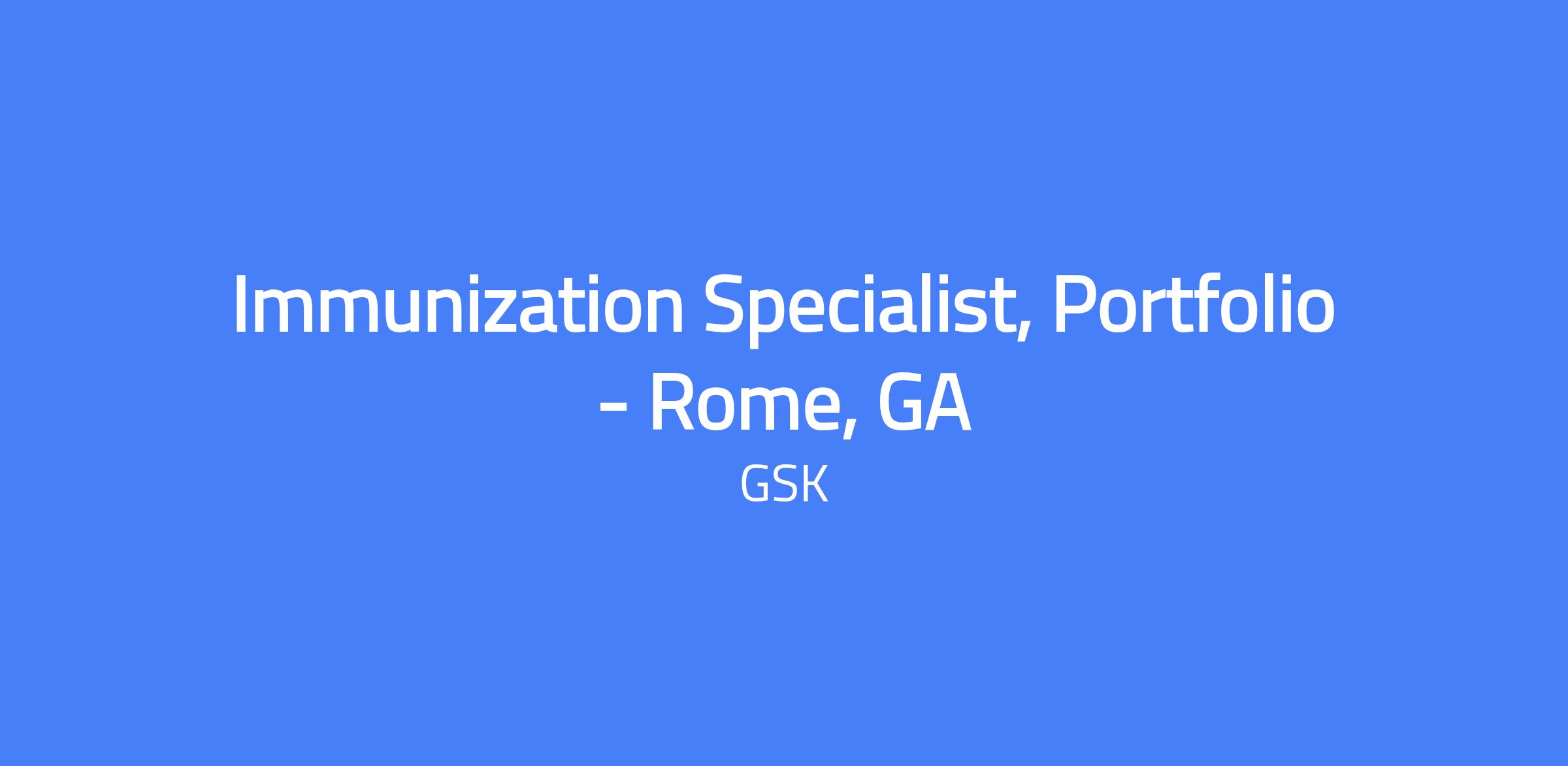 Immunization Specialist, Portfolio - Rome, GA. The Hybrid Immunization Specialist engages healthcare providers to drive vaccine uptake across Adult and Pediatric customers. The role educates HCPs and their office staff on disease prevention and GSK’s vaccine portfolio, translating clinical data into conversations that support vaccination goals. Reports to the Vaccine Sales Director and collaborates closely with field and account leadership to ensure coordinated and compliant execution. This is a field-based position with domestic travel as necessary.
