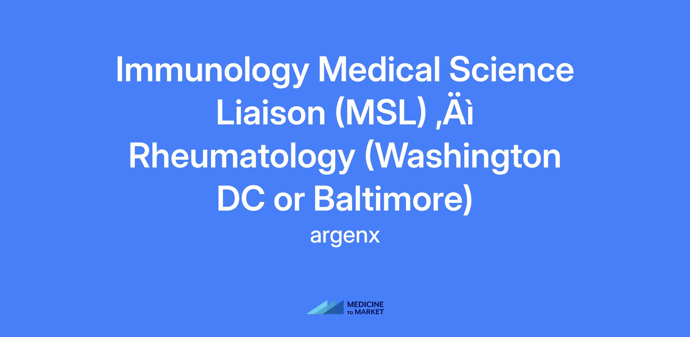 Immunology Medical Science Liaison (MSL) – Rheumatology, field-based role supporting the Washington DC or Baltimore region. The MSL represents argenx as a science-driven, patient-centric partner, engaging with academic and community healthcare stakeholders, and collaborating with cross-functional teams on scientific data, products, and trials.