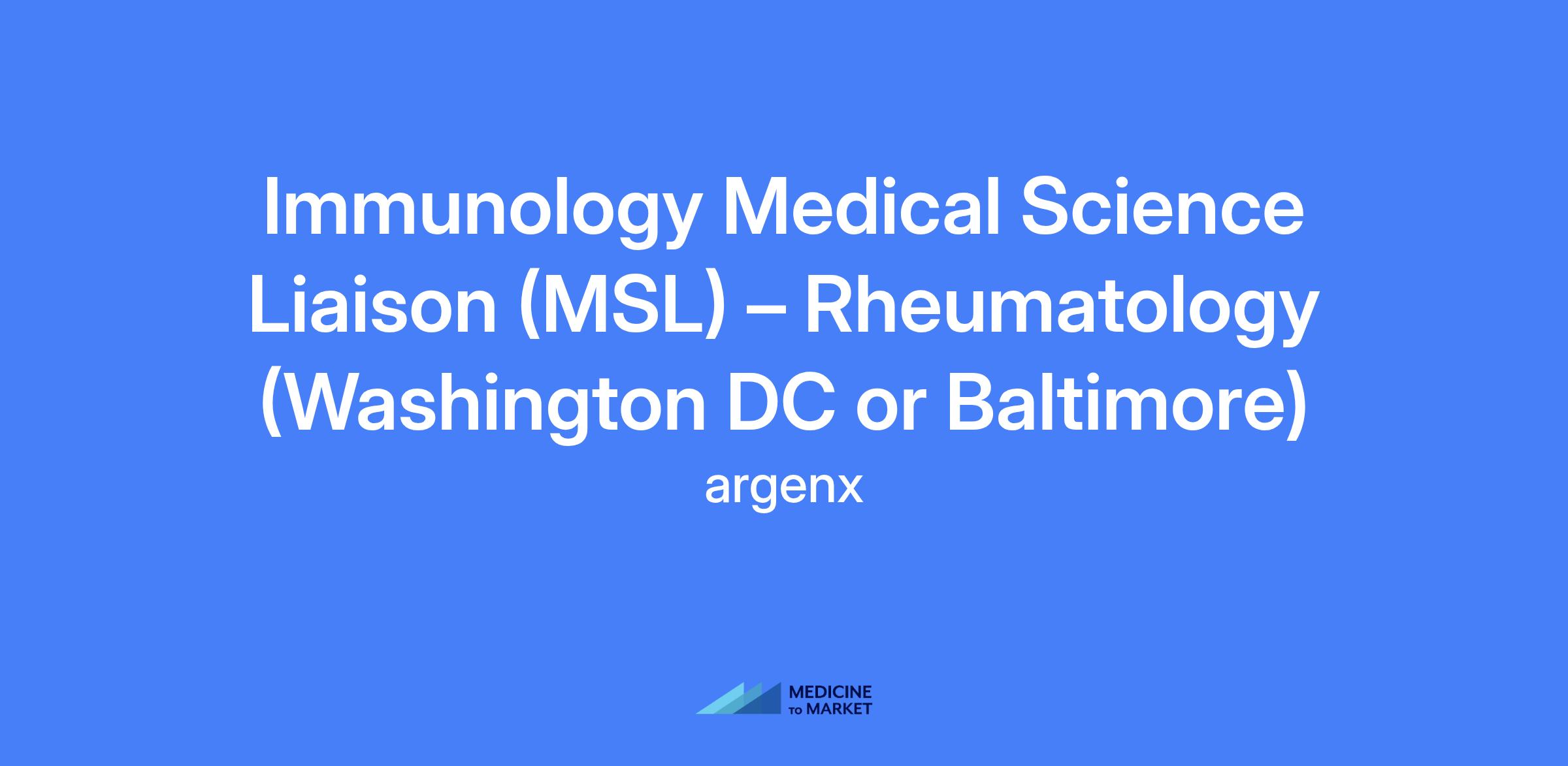 Immunology Medical Science Liaison (MSL) – Rheumatology, field-based role supporting the Washington DC or Baltimore region. The MSL represents argenx as a science-driven, patient-centric partner, engaging with academic and community healthcare stakeholders, and collaborating with cross-functional teams on scientific data, products, and trials.