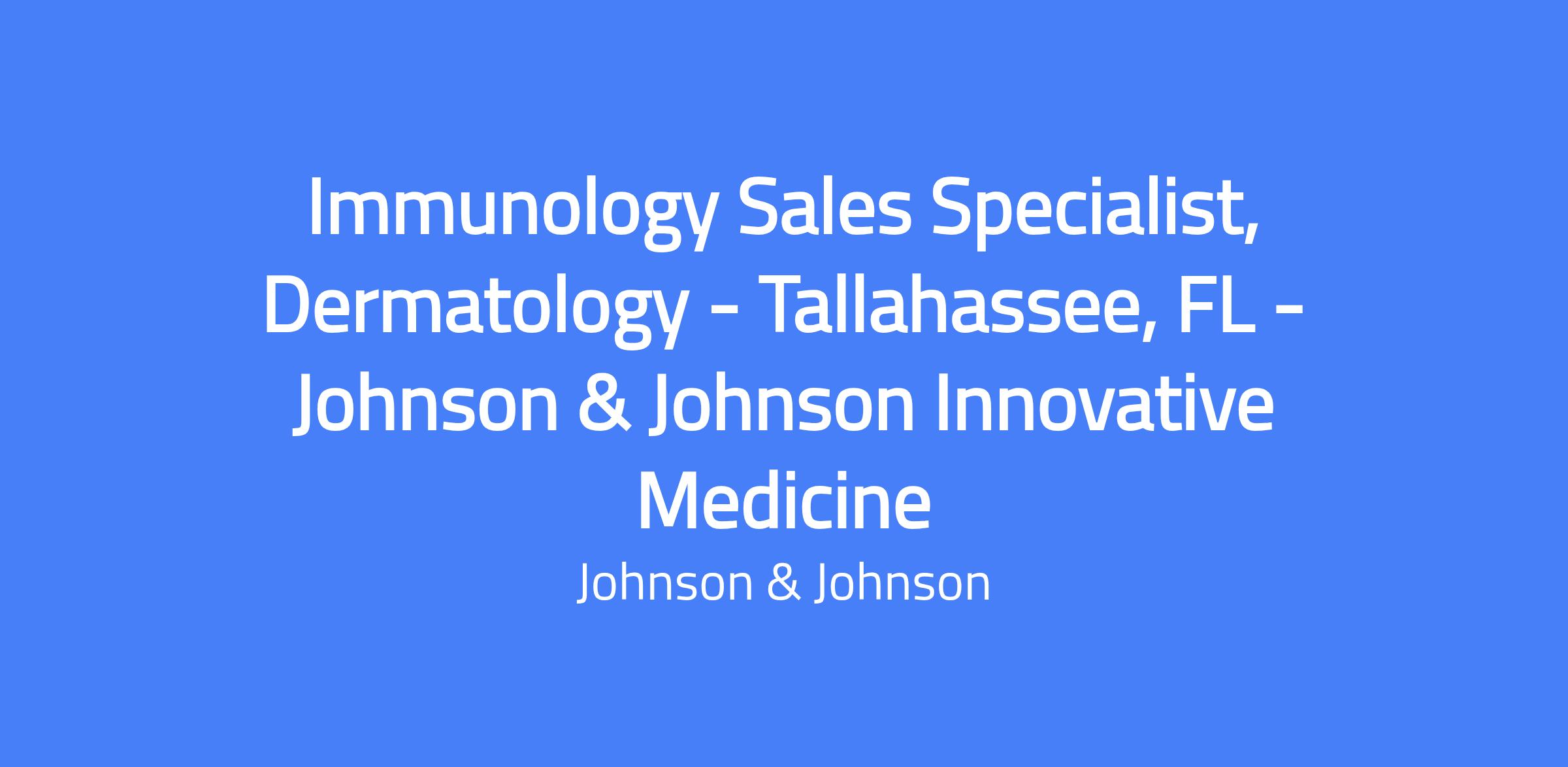 Immunology Sales Specialist, Dermatology covering the Tallahassee, Pensacola, and Panama City Beach territory. You will sell immunology products to dermatology healthcare professionals and related stakeholders, with a focus on attaining sales objectives, communicating complex clinical and business information, and executing local marketing strategies. The role requires building relationships with key decision makers and traveling as necessary; residence near the geography or relocation may be required.