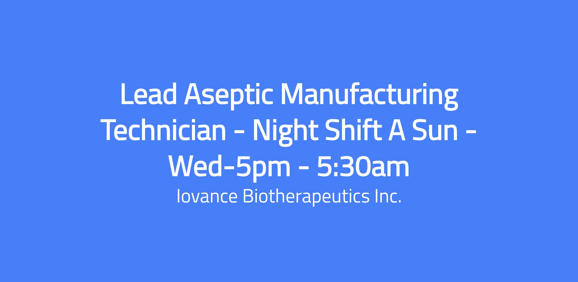 Iovance Biotherapeutics is an immuno-oncology company focused on the development and commercialization of novel cancer immunotherapies based on tumor infiltrating lymphocytes (TIL). TLead Aseptic Manufacturing Technician - Night Shift A Sun - Wed-5pm - 5:30am role is crucial for the autologous cell therapy manufacturing program. This position requires a broad understanding of theories, techniques, and principles to support manufacturing processes. As an Aseptic Manufacturing Technician I, you will primarily be responsible for the following tasks: suite preparation for cell processing, material transfer, environmental monitoring, BSC runner duties, final product inspection, and final product cryopreservation in controlled rate freezers, for commercial and clinical use. This position works across different shifts. Depending on your assigned shift, you may be required to work overtime, weekends, and holidays to ensure the manufacturing process is completed.
