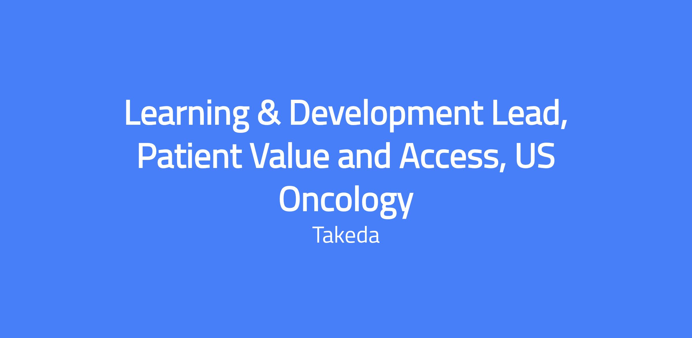 Learning & Development Lead, Patient Value and Access, US Oncology. As a member of Takeda Oncology, as an Associate Director, your work will contribute to our bold, inspiring vision to cure cancer. Here, you'll build a career grounded in purpose and be empowered to deliver your best. As part of the U.S. Oncology Team, you will report to the Head of US OBU Strategy & Business Operations. Location: Boston, MA.