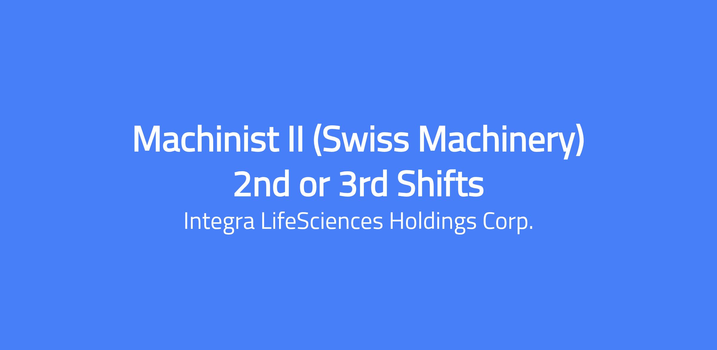 Changing lives. Building Careers. Joining us is a chance to do important work that creates change and shapes the future of healthcare. Thinking differently is what we do best. To us, change equals opportunity. Every day, our colleagues are challenging whatâs possible and making headway to innovate new treatment pathways to advance patient outcomes and set new standards of care. The Machinist Technician II performs machine operation and assembly in a job shop or high-volume applications. Processes components to meet print and/or geometric tolerance requirements. Responsible for the setup, operation and maintenance of production machinery, maintenance of proper documentation and support of the manufacturing engineering function. To perform this job successfully, an individual must be able to perform each essential duty satisfactorily. Primary responsibilities are to: Under general supervision, completes tasks as directed by SOPs, routers, prints, work instructions, and manufacturing schedules. Operates machining equipment under close supervision and learns machining and metal removal concepts which include milling, turning, grinding, and other methods. Observes operation of machine and verifies conformance of machined work pieces to specifications using measuring instruments such as fixed gauges, calipers, and micrometers. Adheres to dimensions and tolerances found on prints. May use prints and sketches to determine proper methods and processes. Learns process of maintaining machine maintenance files. Reworks productions parts and performs emergency rework and/or modification of production parts as directed. Performs in-process checks using measuring devices and reports defective materials or questionable conditions to the department lead person or supervisor. Maintains the work area and equipment in a clean and orderly condition and follows prescribed safety regulations. Works on projects as part of a team, exchanging ideas and contributing skills that complement those of the other team members. Fulfills commitments to team members. Performs assembly, deburring, and other duties as required. May perform setup of manual machines and perform tool offset changes on CNC machines. Perform basic machine set-up. Perform basic selection and care of special machine tools such as drills, jigs, mills, lathes, and fixtures. Diagnoses basic machine problems using proper diagnostic tools. Learns the maintenance of CNC program files. Maintains machine maintenance files. Modifies basic existing processes if necessary. Inspects basic prototypes, machines prototype fixtures and First Article components. May perform programming and operation of FOBA lasers. Ability to communicate verbally, written, and interpersonal skills required to work with others. Train others. Note: Other duties may be assigned as necessary. QUALIFICATIONS The requirements listed below are representative of the knowledge, skill, and/or ability required for this position. High School diploma or equivalent. Manufacturing experience preferred. 2 to 5 years of related experience with trade school certification preferred where applicable. Full knowledge of machinist role and substantial acquaintance with and understanding of the machining of routine parts. Position will use machining and metal removal equipment which may include milling, turning, grinding and other methods and measuring instruments such as fixed gauges, calipers, and micrometers. Ability to utilize a desktop computer with typical business programs installed. Salary Pay Range: $22.79 - $30.77 USD Hourly Our salary ranges are determined by role, level, and location. Individual pay is determined by several factors including job-related skills, experience, and relevant education or training. In addition to base pay, employees may be eligible for bonus, commission, equity or other variable compensation. Your recruiter can share more about the specific salary range for your preferred location during the hiring process. Additional Description for Pay Transparency: Subject to the terms of their respective plans, employees and/or eligible dependents are eligible to participate in the following Company sponsored employee benefit programs: medical, dental, vision, life insurance, short- and long-term disability, business accident insurance, and group legal insurance, and savings plan (401(k)). Subject to the terms of their respective policies and date of hire, Employees are eligible for the following https://jobs.integralife.com/total-rewards/ Integra LifeSciences is an equal opportunity employer, and is committed to providing equal employment opportunities to all qualified applicants and employees regardless of race, marital status, color, religion, sex, age, national origin, sexual orientation, physical or mental disability, or protected veteran status. This site is governed solely by applicable U.S. laws and governmental regulations. If you'd like more information on your rights under the law, please see the following notices: EEO Is the Law | EOE including Disability/Protected Veterans Integra LifeSciences is committed to provide qualified applicants and employees who are disabled veterans or individuals with disabilities with needed reasonable accommodations in accordance with the ADA. If you have difficulty using our online system due to a disability and need an accommodation, please email us at careers@integralife.com. Unsolicited Agency Submission Integra LifeSciences does not accept unsolicited assistance from search firms for employment opportunities. All CVs/resumes submitted by search firms to any employee at our company without a valid written search agreement in place for this position will be deemed the sole property of our company. No fee will be paid in the event a candidate is hired by our company as a result of an agency referral where no pre-existing agreement is in place. A formal written agreement is required before engaging any agency, and it must be executed 