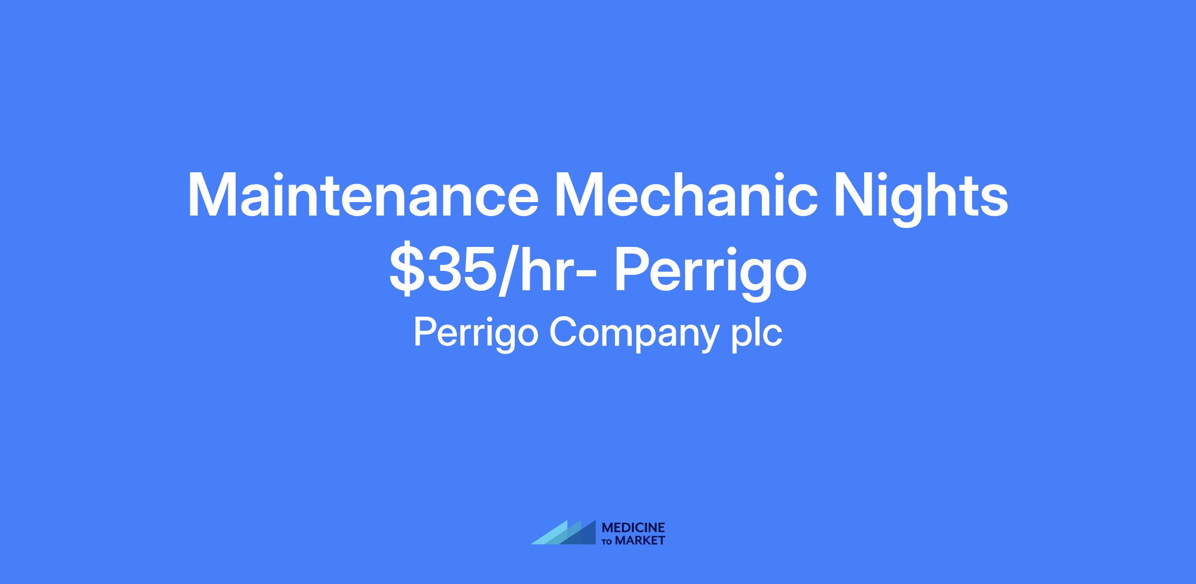Maintenance Mechanic Nights at Perrigo (Eau Claire, WI) working the Nights Shift (6pm - 6am ET) on a biweekly 2/2/3 schedule. Full-time, non-exempt, unionized position with starting pay of $35.00 per hour plus $2.00 shift premium; comprehensive benefits package available.
