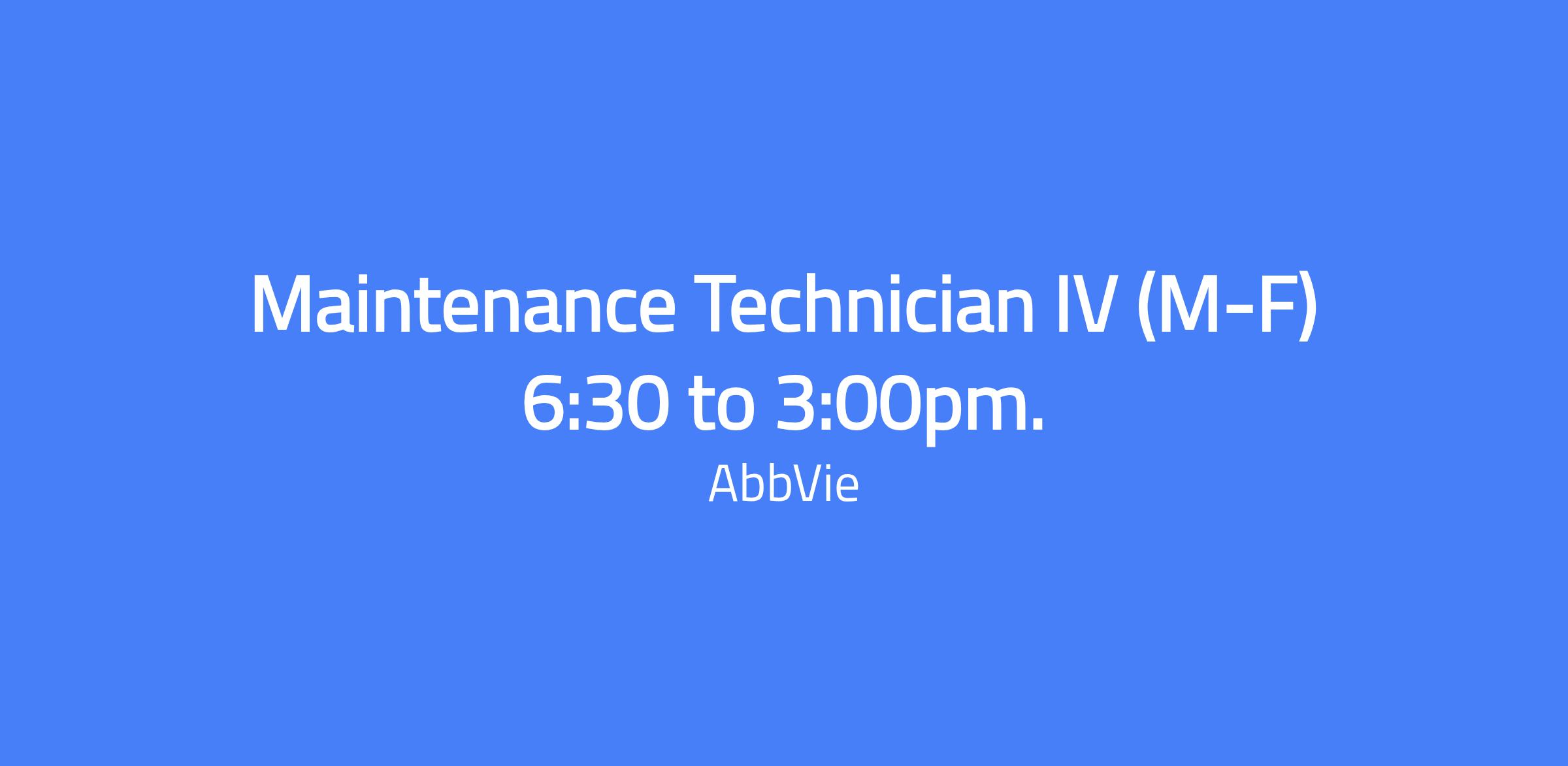 Maintenance Technician IV (M-F) 6:30 to 3:00pm. Independently perform senior-level support within the maintenance department, trains lower-level Technicians on more advanced tasks, and drives technical, safety, and process improvement efforts using a variety of industry methods.