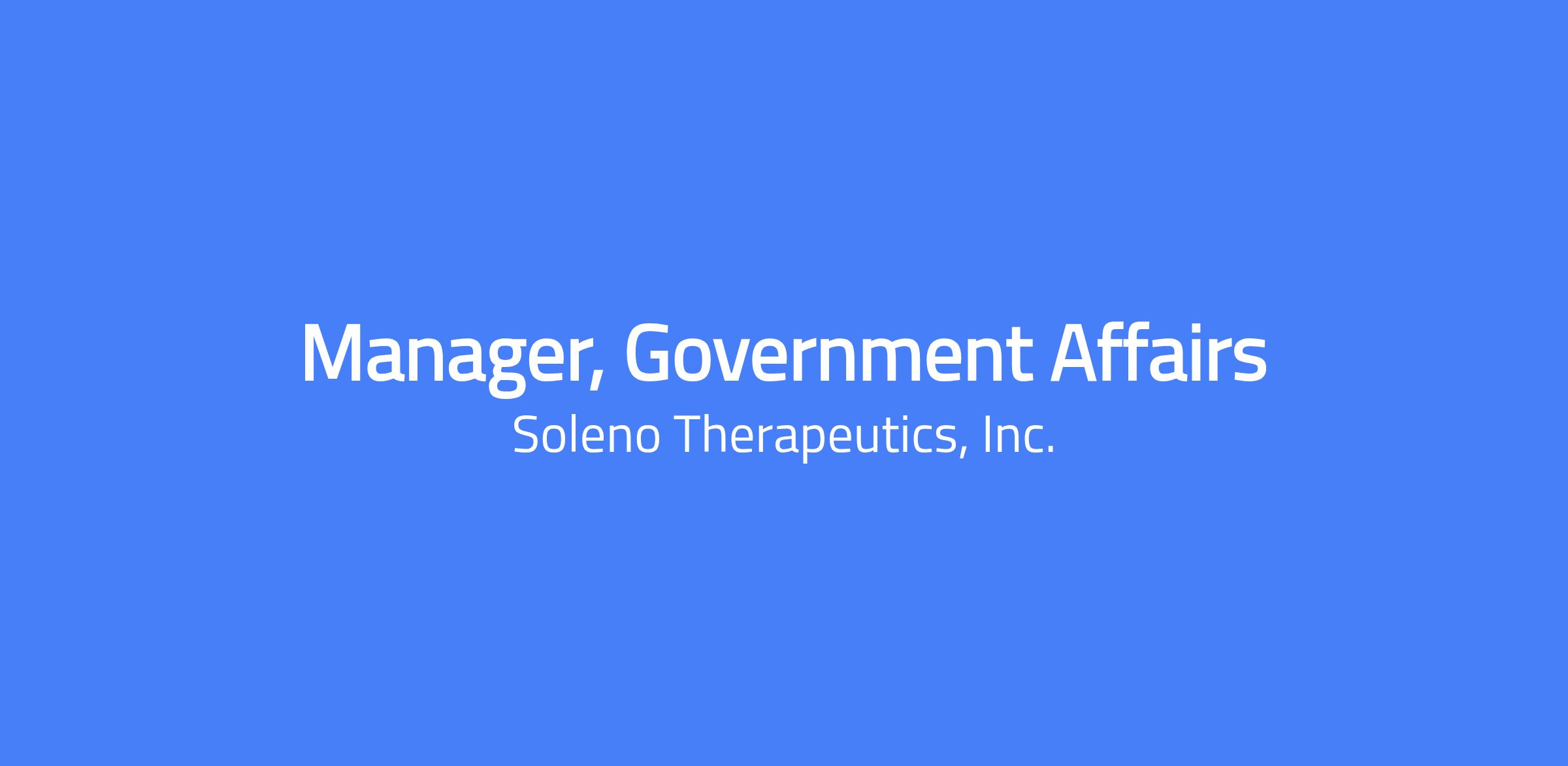 The Manager, Government Affairs (GA) will support the implementation of Soleno’s government affairs function. This Manager will engage with government stakeholders at the federal and state levels to help shape a favorable policy environment for rare disease therapeutics (especially PWS), and support access, reimbursement, regulatory alignment, and advocacy initiatives.