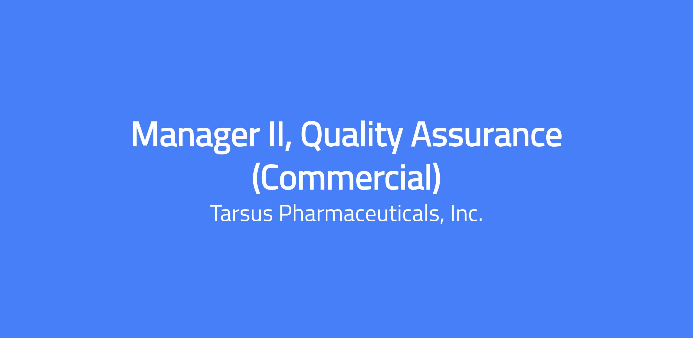 Reporting to the Associate Director, Quality Assurance, the Manager II, Quality Assurance, is responsible for the review and processing of manufacturing Deviations and Laboratory OOS, and review of manufacturing-related Change Controls within Tarsus’ established QMS system. This role will also be responsible for authoring Annual Product Reviews, analyzing and trending analytical data, approval of Certificates of Analysis, manufacturing batch record review and product disposition. This is a hybrid role based in Irvine, CA (three days per week in the office).