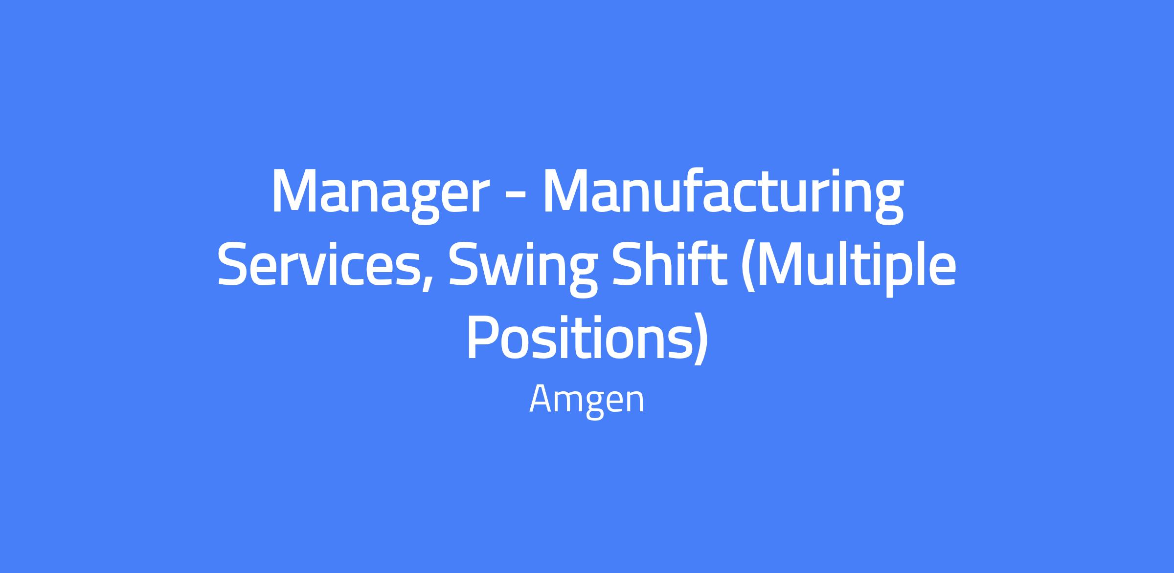 Manager - Manufacturing Services, Swing Shift (Multiple Positions). Provide leadership and guidance to the Manufacturing Services team supporting 24/7 operations, including Raw Material and Solution Logistics, Weighing and Dispensing, Buffer/Media Solution Preparation, Parts Washer, and Autoclave. This role works a 12-hour 2-2-3 shift from 9:30 am to 10:00 pm and may require overtime, inclement weather, and holidays as needed. You will hire and train external workers, partner with a multidisciplinary team, and drive safety, quality, and continuous improvement across the department.