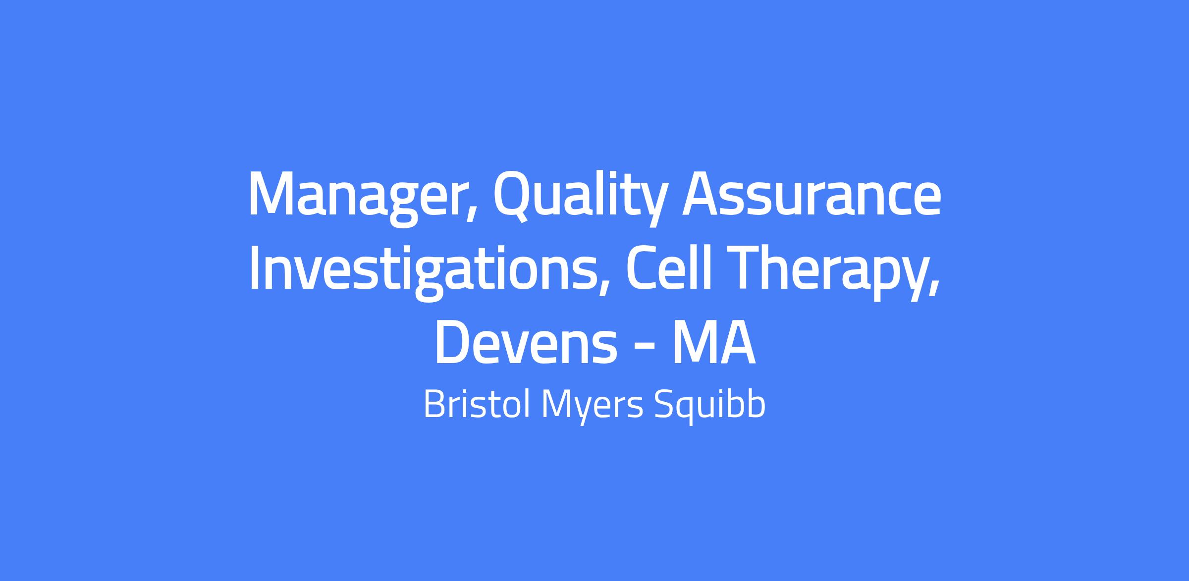 Manager, Quality Assurance Investigations—Devens Cell Therapy Facility. Provide quality oversight and approval of Deviation investigations and associated Action and Effectiveness Check records for manufactured products, in compliance with applicable regulations and BMS policies.