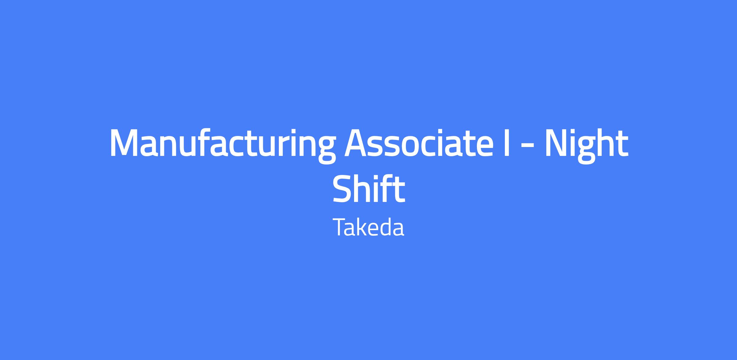 Manufacturing Associate I – Night Shift. Location: Brooklyn Park, MN. This role operates on a rotating night schedule from 5:45 PM to 6:15 AM and involves performing and documenting daily manufacturing operations in a cGMP environment, operating biologics production equipment, and executing validation protocols.