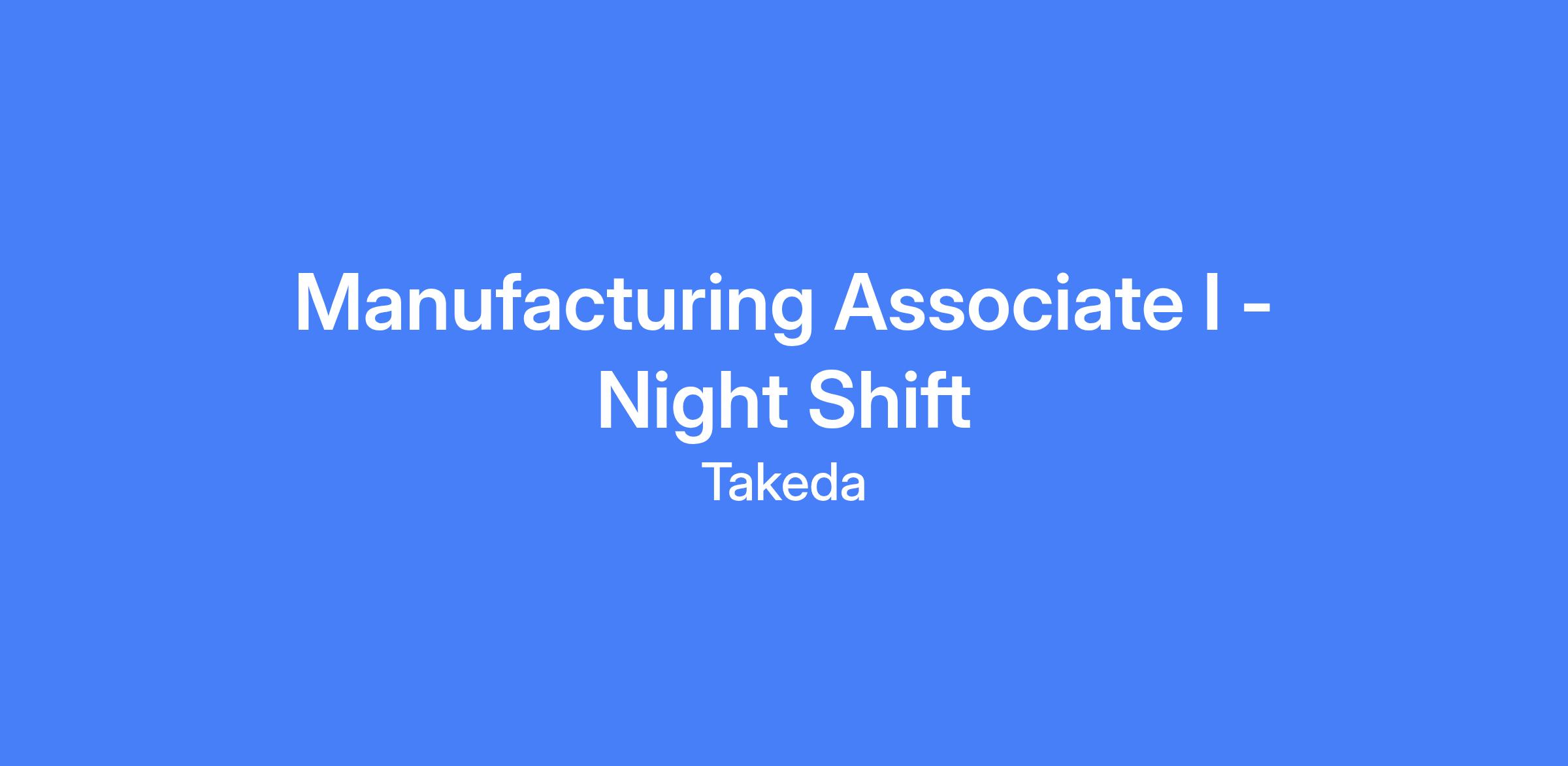 Manufacturing Associate I – Night Shift. Location: Brooklyn Park, MN. This role operates on a rotating night schedule from 5:45 PM to 6:15 AM and involves performing and documenting daily manufacturing operations in a cGMP environment, operating biologics production equipment, and executing validation protocols.