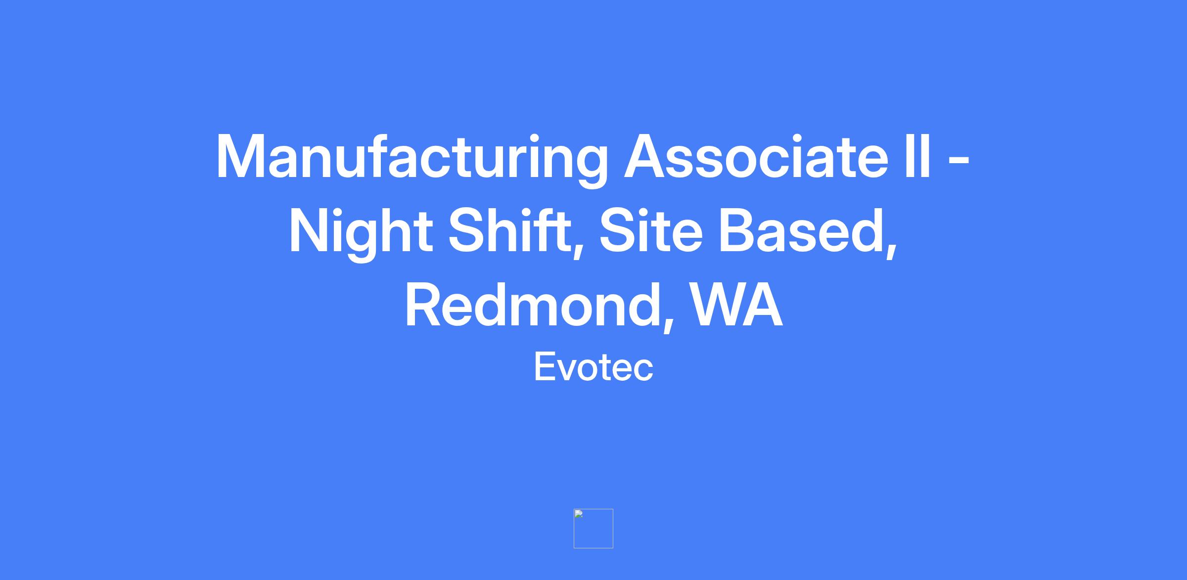 Manufacturing Associate II, Night Shift - Redmond, WA site. Responsible for commercial manufacturing of mammalian cell-based biotherapeutics under cGMP conditions, executing process recipes, monitoring equipment, sampling, and assisting in media and buffer preparation. Requires following safety procedures, cGMP practices, SOPs, and manufacturing documentation. Night shift runs every other Saturday night to Wednesday morning (19:00 - 08:00).