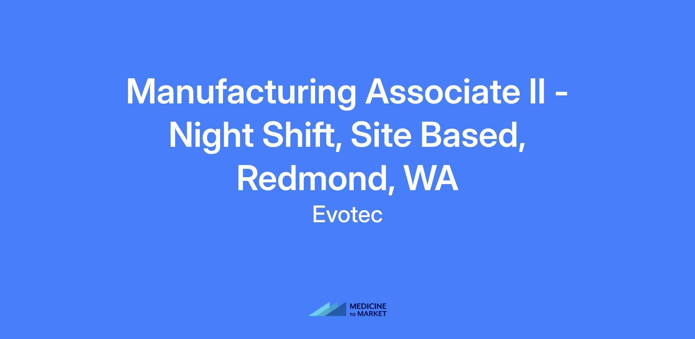Manufacturing Associate II, Night Shift - Redmond, WA site. Responsible for commercial manufacturing of mammalian cell-based biotherapeutics under cGMP conditions, executing process recipes, monitoring equipment, sampling, and assisting in media and buffer preparation. Requires following safety procedures, cGMP practices, SOPs, and manufacturing documentation. Night shift runs every other Saturday night to Wednesday morning (19:00 - 08:00).