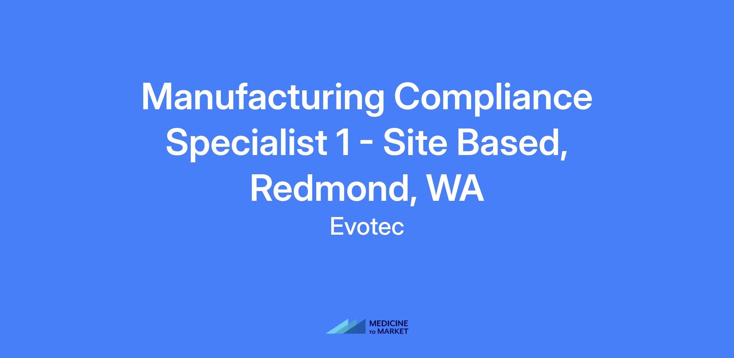 Manufacturing Compliance Specialist I at Just Evotec Biologics. Site-based role in Redmond, WA with some travel to Seattle, WA as required. 40 hours per week, Monday to Friday, days. Focus on leading deviation investigations and managing CAPAs to maintain product quality and regulatory compliance within the MSAT team.