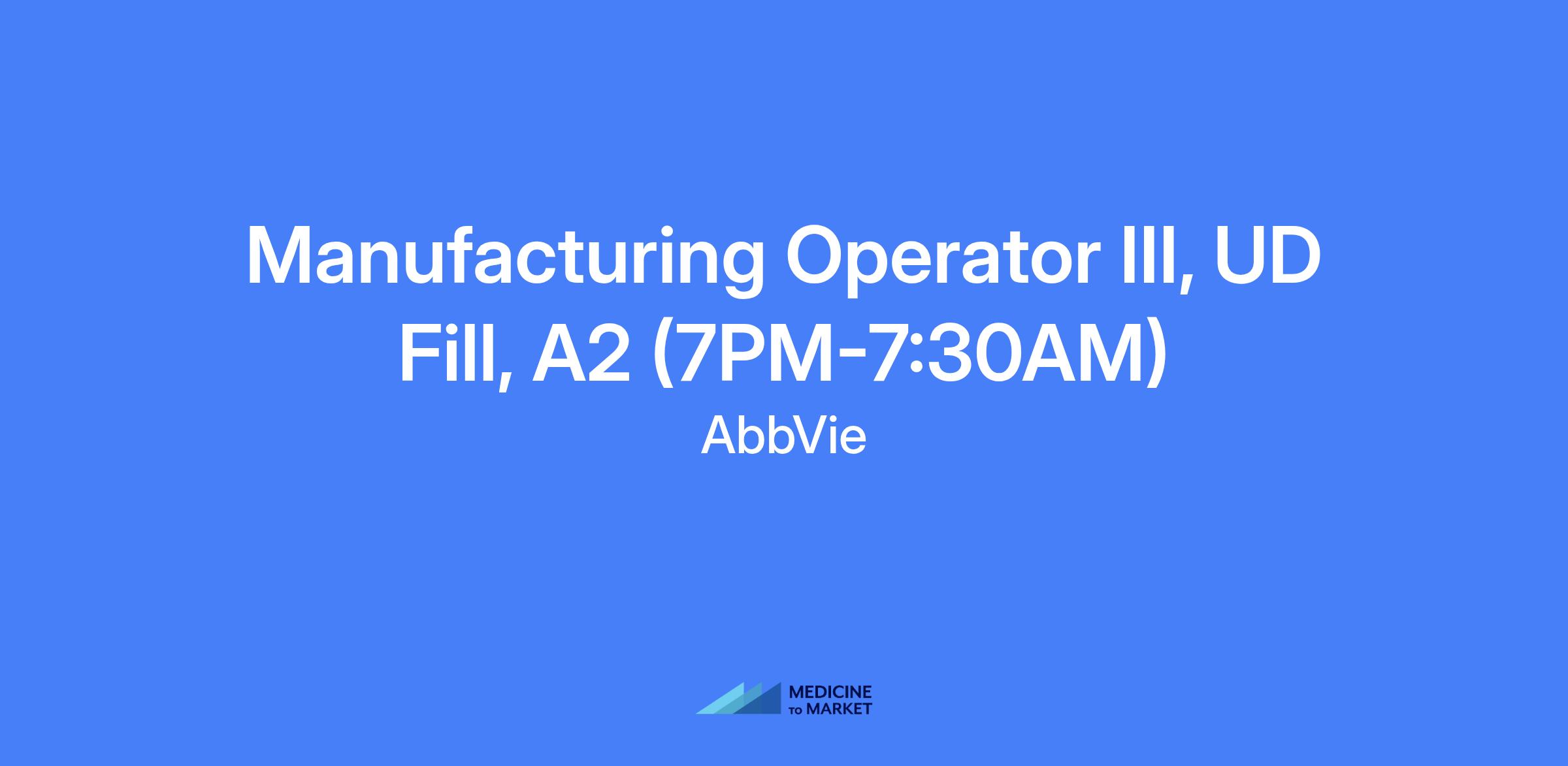 Manufacturing Operator III, UD Fill, A2 (7PM-7:30AM) responsible for production line duties to meet goals while ensuring quality and safety standards. Operates production equipment and completes documentation in accordance with cGMPs and SOPs, monitoring product to maintain quality.