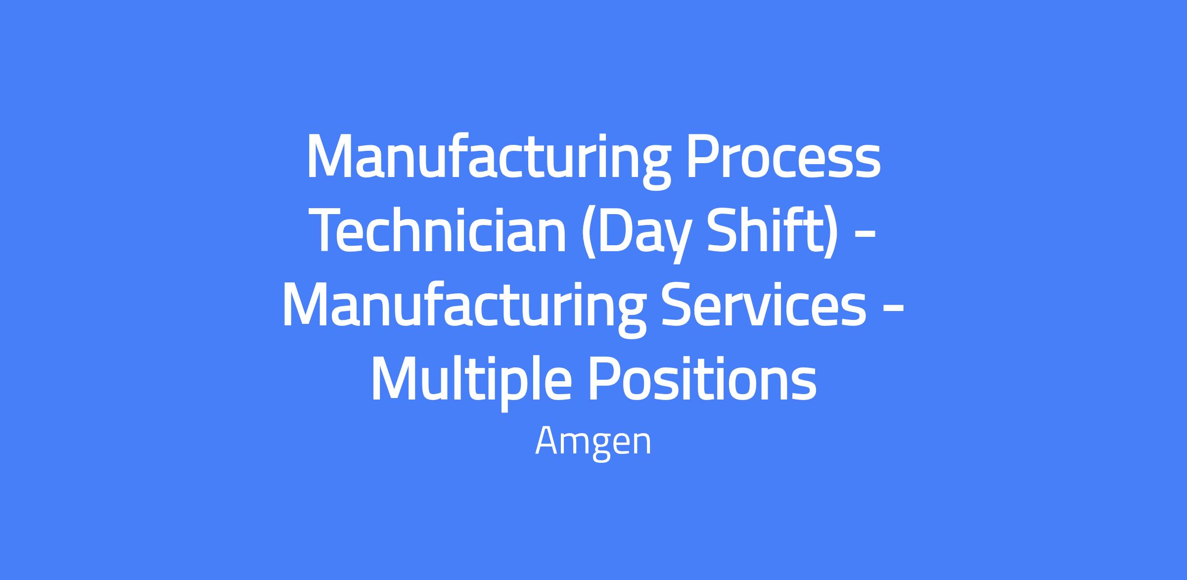 Manufacturing Process Technician (Day Shift) for Manufacturing Services at Amgen North Carolina. Supports 24/7 manufacturing operations in the Services area, performing on-the-floor operations to manufacture cGMP drug substances on a 12-hour 2-2-3 shift (5:45am–6:15pm). Performs setup, cleaning, sanitization, monitoring of equipment, buffer and media preparation, material weighing and dispensing, and on-floor documentation, all in accordance with cGMP procedures; accurate gowning and aseptic technique are required. Must be able to work assigned shift and overtime as needed.