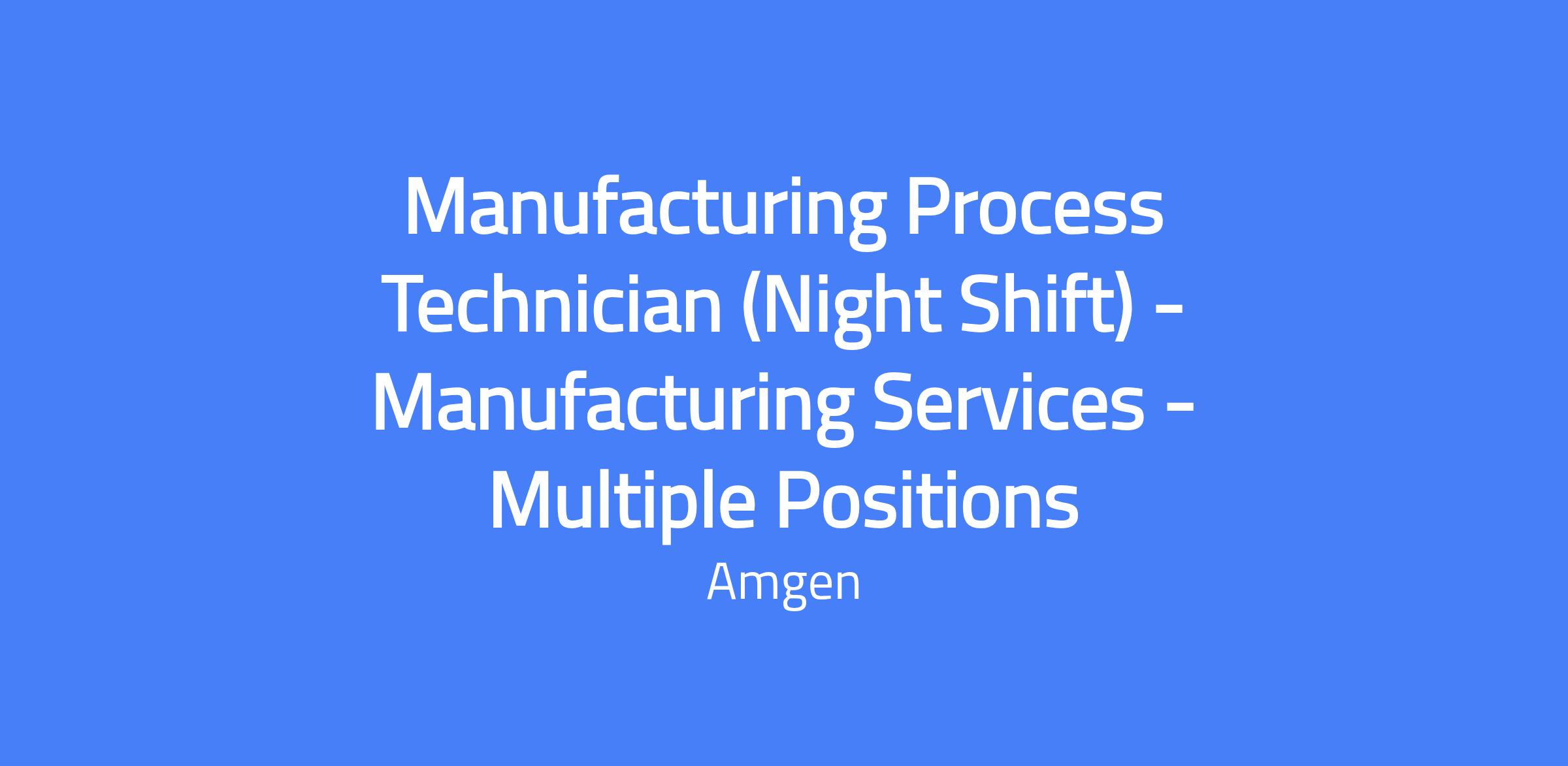 Manufacturing Process Technician (Night Shift) in Manufacturing Services, Amgen North Carolina. Supports 24/7 manufacturing operations on a 12-hour 2-2-3 schedule (5:45pm–6:15am). Performs floor operations in the Services area and is responsible for the manufacturing of cGMP drug substances under general direction for routine work and detailed instructions for new assignments.