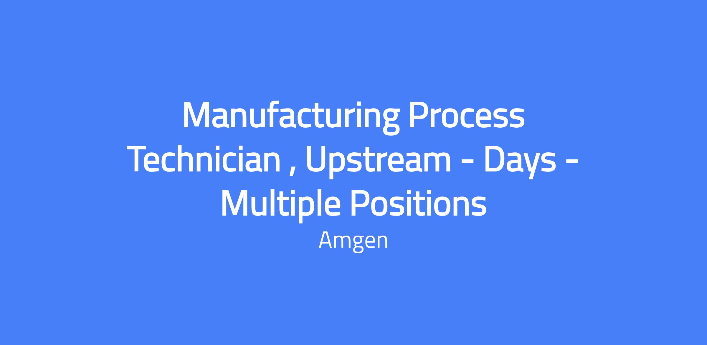 Manufacturing Process Technician I, Upstream - Days - Multiple Positions. This role supports Amgen's Upstream manufacturing operations at Amgen North Carolina (ANC) and participates in 24/7 manufacturing. The position works a 12-hour 2-2-3 schedule from 5:45am to 6:15pm and performs floor operations in the Services area to manufacture cGMP drug substances.