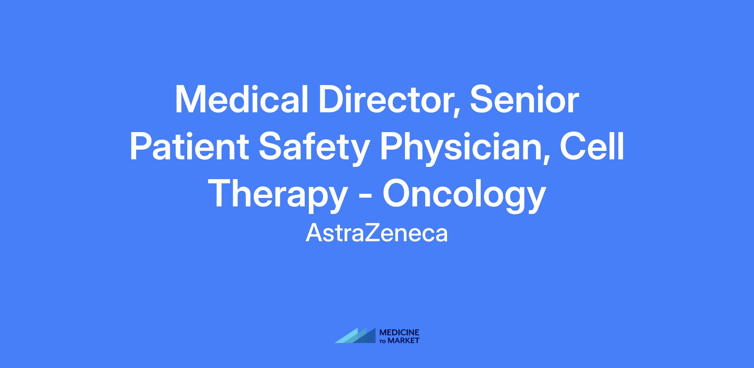 Medical Director, Senior Patient Safety Physician, Cell Therapy Oncology. Lead medico-scientific and clinical strategy for patient safety in oncology/haemato-oncology cell therapies; provide leadership within the Cell Therapy Patient Safety Unit; ensure compliance with Good Clinical and Pharmacovigilance Practice and regulatory requirements; coach and mentor junior staff.