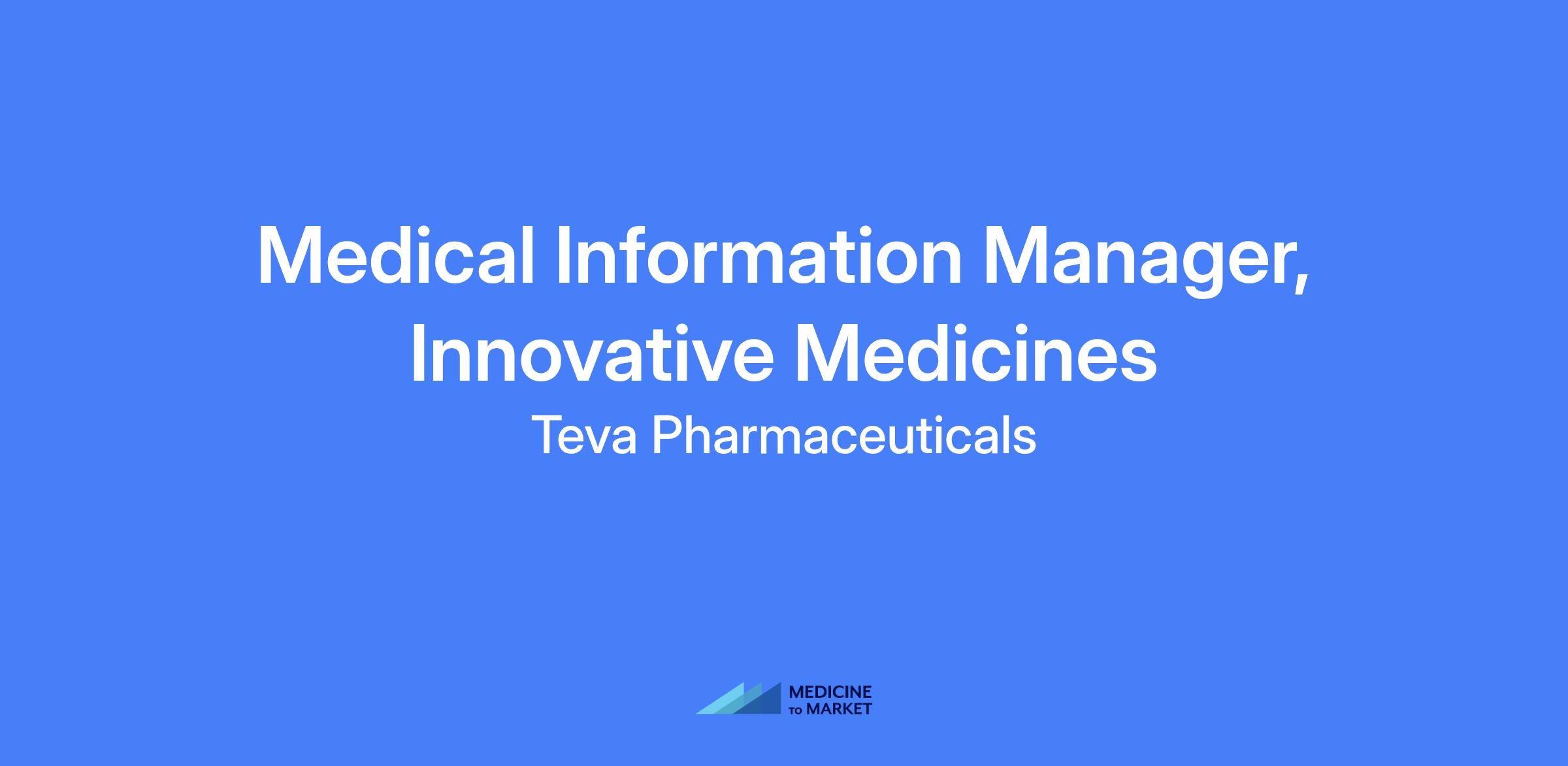 Medical Information Manager, Innovative Medicines. Manage medical information and communication for assigned Teva branded products by providing oversight for prompt, accurate, scientifically and medically balanced responses to unsolicited medically-related inquiries from internal and external customers. Collaborate with North America Medical Affairs and cross-functional teams to support development, implementation, and maintenance of medically-related activities related to TevaβΓΓ΄s branded products. Follow all policies, SOPs, and work instructions.