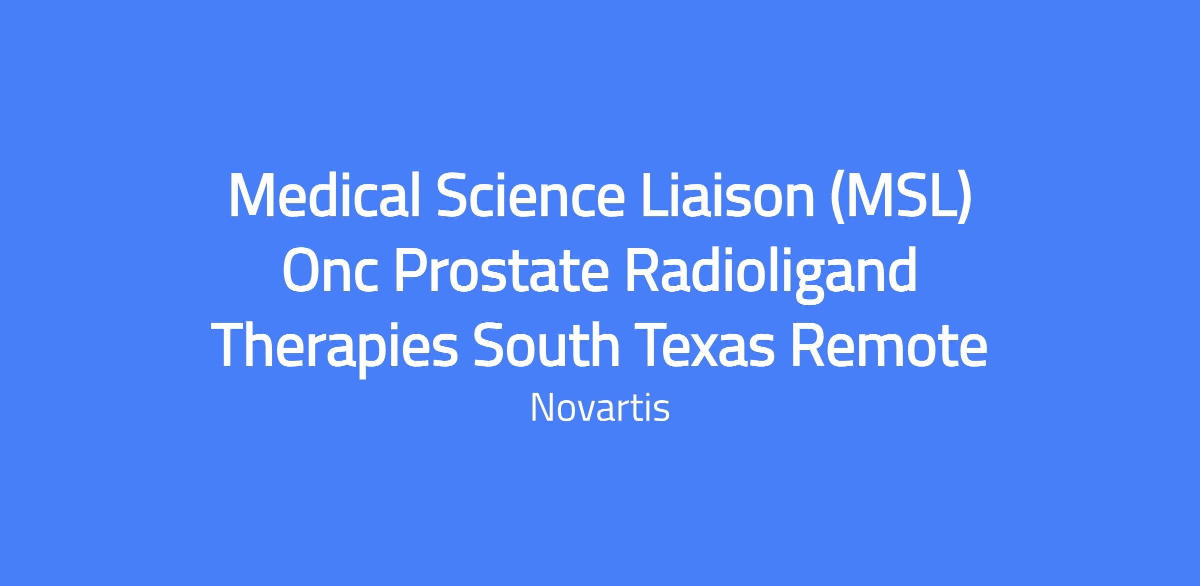 Medical Science Liaison (MSL) for Oncologic Prostate Radioligand Therapies in South Texas. This field-based, customer-facing, non-promotional medical and scientific role focuses on advancing clinical practice to improve patient outcomes within the assigned territory. The MSL engages Healthcare Providers and medical experts, develops the territory, and executes activities in alignment with the medical strategy and Novartis compliance policies. The territory covers South Texas; the preferred residence is the greater Houston area, and candidates must live within 50 miles of the territory boundary; relocation is not offered.