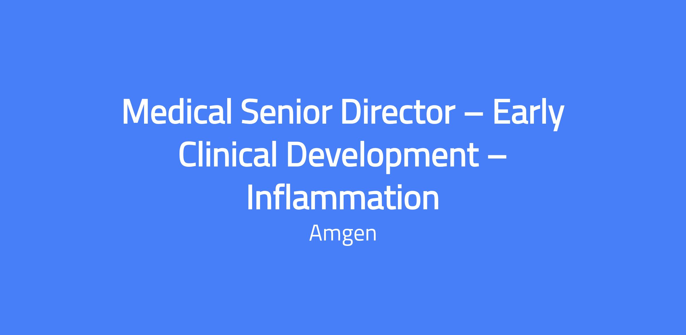 Medical Senior Director β Early Clinical Development is a scientific leadership role responsible for providing medical direction for pre-clinical/early clinical programs in Amgenβs Inflammation/General Medicine Early Development pipeline, developing strategy for early phase clinical development from first-in-man studies through proof of concept and translational projects as part of the initial drug development strategy.