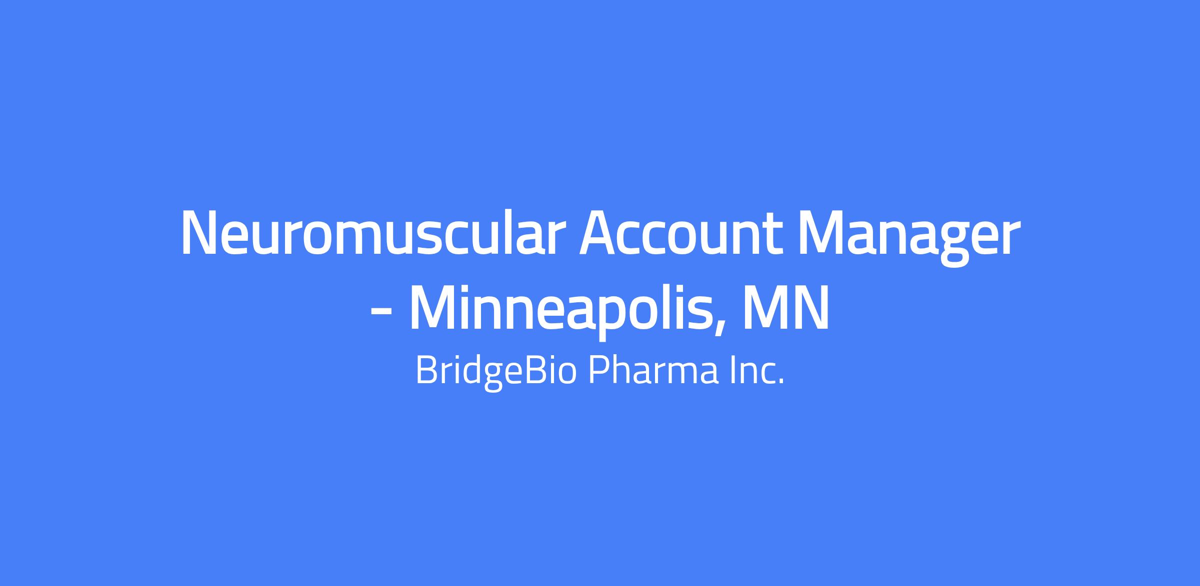 The Neuromuscular Account Manager is a high-impact field-based position that is critically important to BridgeBio’s success. They will be patient champions with exceptional business and clinical acumen to execute product launches with sustained excellence. In doing such, they will bring passion, urgency, and a get-it-done attitude to treating unmet needs in patients.