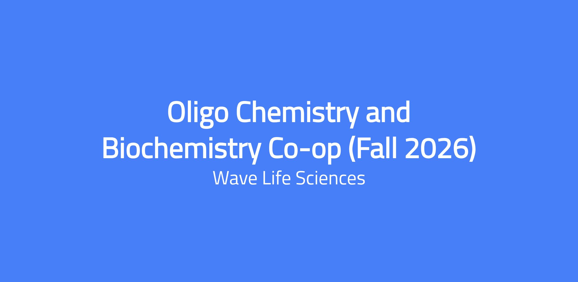 Oligo Chemistry and Biochemistry Co-op (Fall 2026) is a co-op position at Wave Life Sciences in Cambridge, Massachusetts. The role offers exposure to areas of oligonucleotide chemistry and biochemistry/bioanalytical chemistry, with training across a variety of laboratory techniques and instrumentation. It is an opportunity for a motivated student to learn in a fast-paced, cross-disciplinary biotech environment, with strong organizational skills and attention to detail. Organic chemistry or biochemistry laboratory experience is preferred.