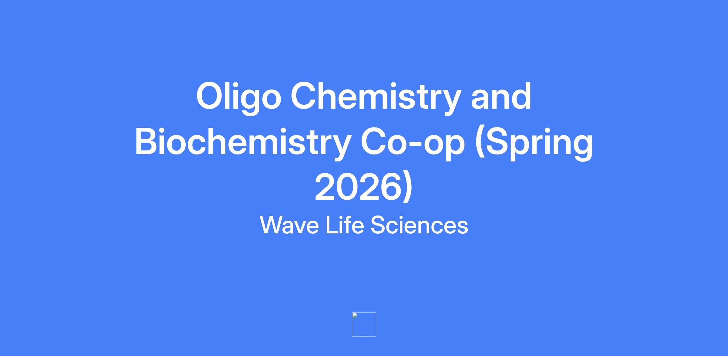Oligo Chemistry and Biochemistry Co-op (Spring 2026) at Wave Life Sciences in Cambridge, MA. The role offers exposure to oligonucleotide chemistry, biochemistry and bioanalytical chemistry, with training across laboratory techniques and instruments in a fast-paced, cross-disciplinary biotech environment. Prior organic chemistry or biochemistry laboratory experience is preferred.