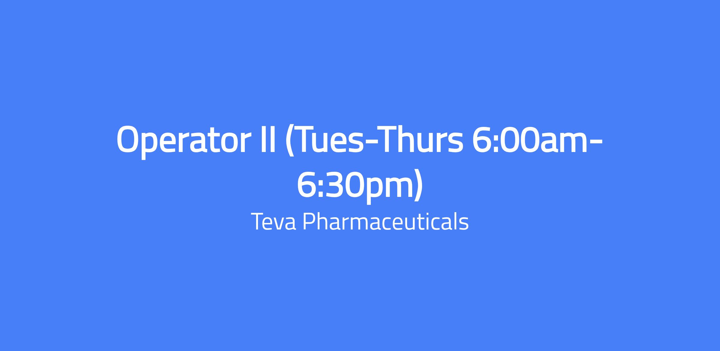 Operator II (Tues-Thurs 6:00am-6:30pm) will perform operations related to the manufacturing and/or packaging of pharmaceutical products, including equipment set-up, operation, clean-up and maintenance, in compliance with regulatory cGMP requirements and company policies and procedures.