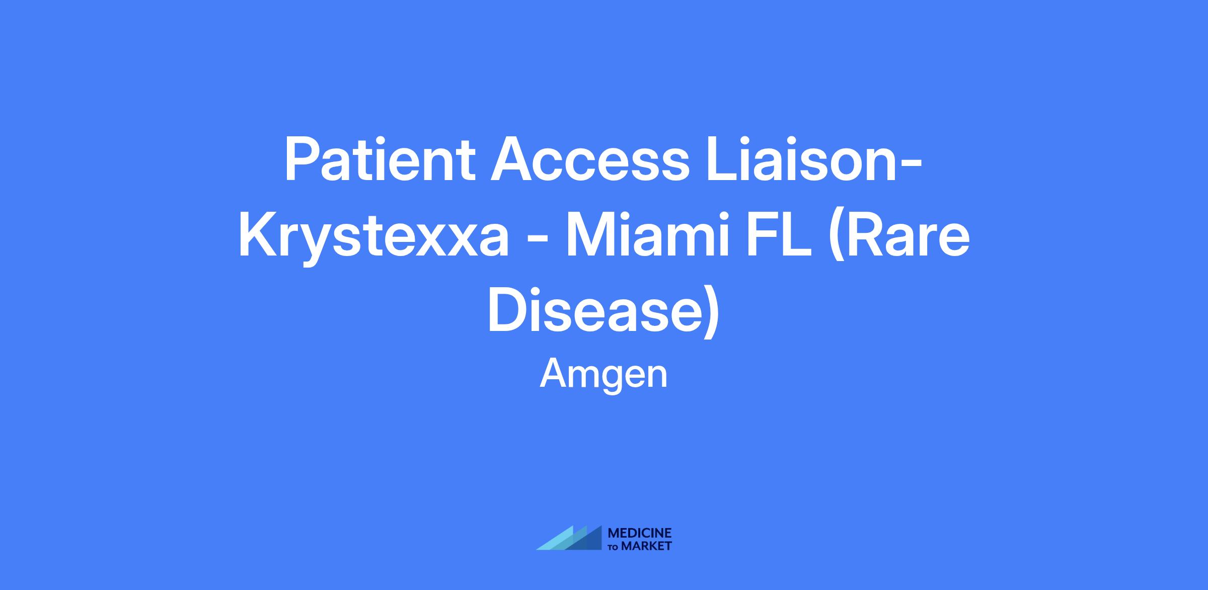 Patient Access Liaison - KRYSTEXXA - Rare Disease. Live in Miami, FL. Provide logistical, non-medical educational assistance to patients, caregivers, and site staff; support ongoing access to therapy and adherence; collaborate with cross-functional teams to facilitate insurance, financial assistance, and resources.