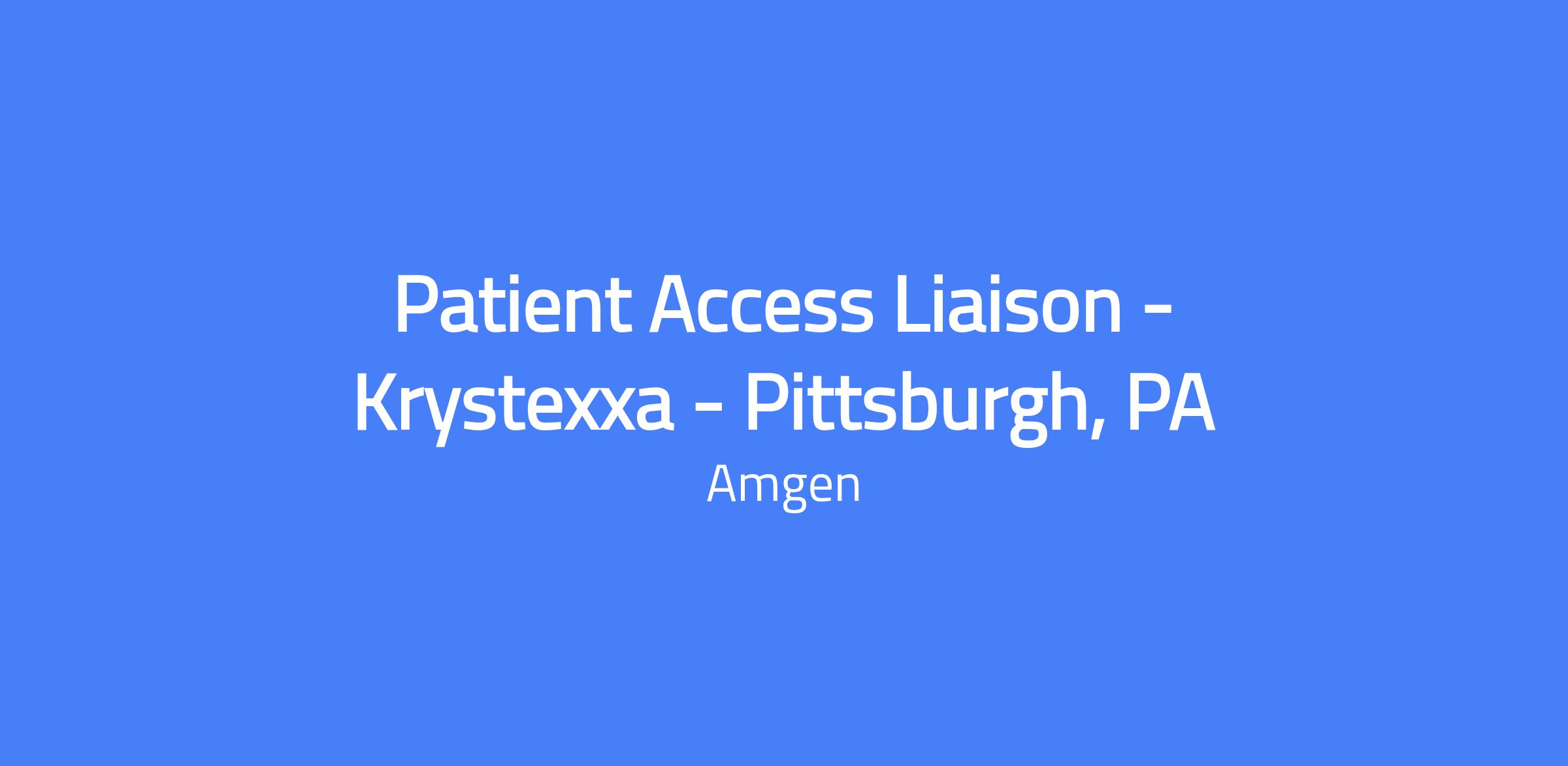 Patient Access Liaison in Pittsburgh, PA responsible for providing logistical, non-medical educational assistance to patients and caregivers, and for supporting access and reimbursement for Krystexxa. Builds relationships with patients, physicians, and site of care staff to educate on next steps required to gain access to therapy and to maintain ongoing adherence, working with cross-functional teams to facilitate insurance coverage and patient support.