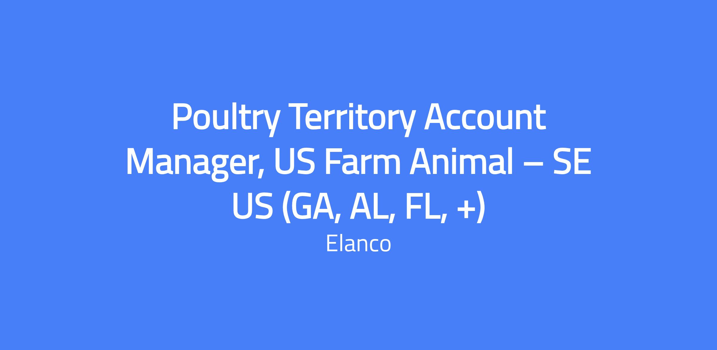 Poultry Territory Account Manager, US Farm Animal โ SE US (GA, AL, FL, +). You will create demand and secure sales by delivering and demonstrating the value of Elanco Animal Health products to direct customers and influencers. Manage the territory through a yearly action plan, account plans, expense management and appropriate communications consistent with Elanco's business unit marketing and sales objectives. The sales territory consists of Poultry customers, veterinarians, nutritionists, feed companies and distribution contacts.