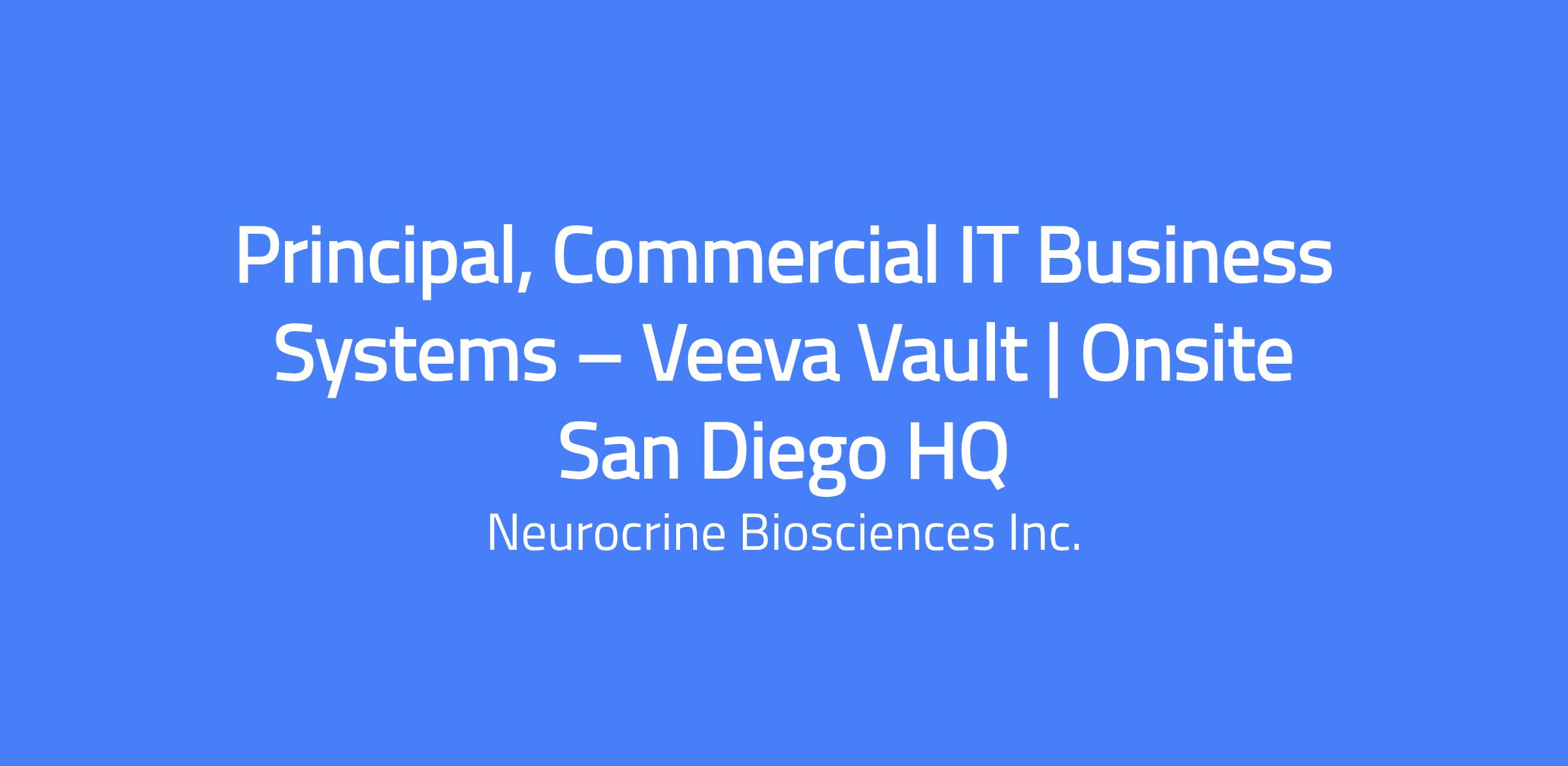 Who We Are: At Neurocrine Biosciences, we pride ourselves on having a strong, inclusive, and positive culture based on our shared purpose and values. We know what it takes to be great, and we are as passionate about our people as we are about our purpose - to relieve suffering for people with great needs. What We Do: Neurocrine Biosciences is a leading neuroscience-focused, biopharmaceutical company with a simple purpose: to relieve suffering for people with great needs. We are dedicated to discovering and developing life-changing treatments for patients with under-addressed neurological, neuroendocrine and neuropsychiatric disorders. The company's diverse portfolio includes FDA-approved treatments for tardive dyskinesia, chorea associated with Huntington's disease, classic congenital adrenal hyperplasia, endometriosis* and uterine fibroids,* as well as a robust pipeline including multiple compounds in mid- to late-phase clinical development across our core therapeutic areas. For three decades, we have applied our unique insight into neuroscience and the interconnections between brain and body systems to treat complex conditions. We relentlessly pursue medicines to ease the burden of debilitating diseases and disorders because you deserve brave science. For more information, visit neurocrine.com, and follow the company on LinkedIn, X and Facebook. (*in collaboration with AbbVie) About the Role: The Principal, Commercial IT Business Systems â Veeva Vault is responsible for supporting the configuration, enhancement, and ongoing optimization across Neurocrineâs Commercial Veeva ecosystem. This role serves as the senior technical bridge between internal Veeva administrators and external managed services partners. The primary objective is to strengthen advanced configuration capability in-house, retain critical business and system knowledge internally, and reduce reliance on vendor advisory support for complex design decisions. Anchored in Veeva Vault and broader Veeva commercial platforms, this role applies technical and functional knowledge to execute system configurations and support cross-functional initiatives. This role will contribute to continuous improvement of system capabilities and processes within the Commercial domain. This role is focused on execution, problem-solving and developing subject matter expertise within the Commercial domain. _ Your Contributions (include, but are not limited to): Apply strong working knowledge for Veeva commercial platforms, including Veeva Vault and related commercial applications Perform advanced configuration beyond standard business-admin scope Configure workflows, security models, objects, lifecycle states, and system enhancements Support and optimize Vault CRM, PromoMats, MedComms, and related Veeva platforms Lead configuration workstreams for system enhancements to support business needs Collaborate with internal teams and managed service partners Review vendor deliverables and provide feedback to ensure alignment with requirements. Contribute to defining requirements and improving clarity prior to vendor engagement. Support documentation of configurations and system changes Develop strong understanding of commercial business processes supported by Veeva platforms Assess cross-system impact of configuration changes Contribute to documentation of system configurations, processes and integration points. Provide input and recommendations on system solutions within scope Partner with Commercial Data Management and MDM teams Collaborate with IT Data Solutions on integration considerations Support alignment of Veeva configurations with commercial data standards Requirements: 5+ years of experience supporting Veeva CRM and commercial IT systems within a life sciences environment Experience supporting Vault applications (PromoMats, MedComms) Experience with Veeva Network (MDM) Familiarity with commercial data environments and enterprise data integration Experience working alongside managed services partners Strong consultative and communication skills Communicates moderately complex concepts and system solutions to stakeholders Manages multiple priorities and deadlines across projects Strong hands-on experience with: Veeva CRM configuration and administration SaaS platform configuration (objects, workflows, security models) Demonstrated experience performing advanced configuration beyond standard administrative tasks Working knowledge of integration patterns and cross-system dependencies Applies knowledge of best practices within the functional discipline and related areas Demonstrates developing expertise in Commercial IT systems and processes Acts as a go-to resource within the team for Veeva-related configuration and support Communicates moderately complex concepts and system solutions to stakeholders Manages multiple priorities and deadlines across projects Neurocrine Biosciences is an EEO/Disability/Vets employer. We are committed to building a workplace of belonging, respect, and empowerment, and we recognize there are a variety of ways to meet our requirements. We are looking for the best candidate for the job and encourage you to apply even if your experience or qualifications donât line up to exactly what we have outlined in the job description. _ The annual base salary we reasonably expect to pay is $132,700.00-$182,000.00. Individual pay decisions depend on various factors, such as primary work location, complexity and responsibility of role, job duties/requirements, and relevant experience and skills. In addition, this position offers an annual bonus with a target of 30% of the earned base salary and eligibility to participate in our equity based long term incentive program. Benefits offered include a retirement savings plan (with company match), paid vacation, holiday and personal days, paid caregiver/parental and medical leave, and health benefits to include medical, prescription drug, dental and vision coverage in accordance with th