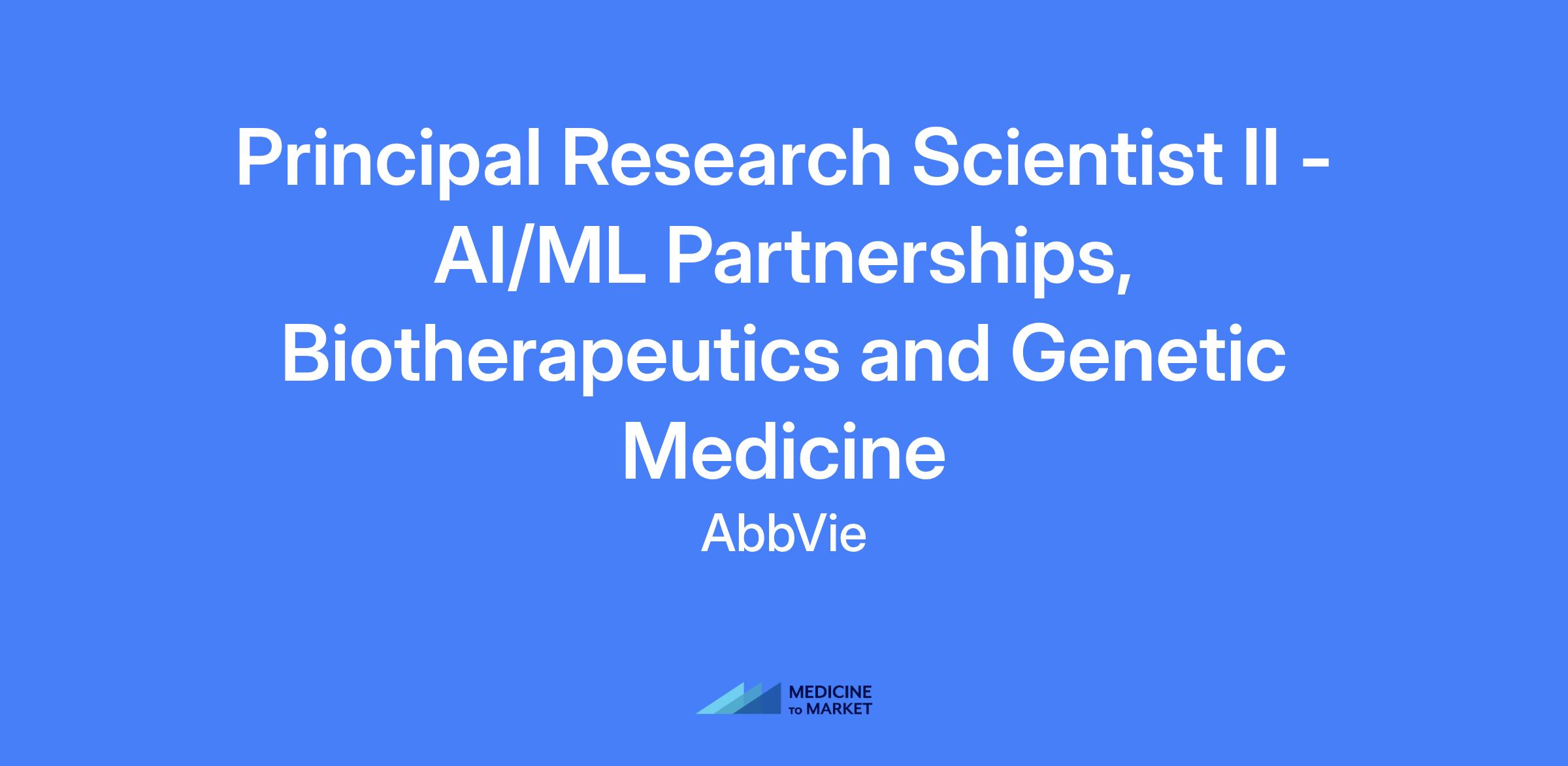 The role of Principal Research Scientist II - AI/ML Partnerships (Biotherapeutics and Genetic Medicine) is a senior leadership position focused on driving AbbVie’s AI/ML external strategy within Biotherapeutics & Genetic Medicine (BGM). The role requires an energetic strategic thinker with deep technical AI/ML expertise in biopharma, capable of representing BGM’s priorities in external engagements and aligning AI/ML initiatives with overarching business objectives. This position reports to the Head of AI/ML in BGM and serves as a trusted advisor to senior leadership, accelerating our application of AI/ML and delivering tangible value to patients. Location options include Worcester, MA; Cambridge, MA; or San Francisco, CA, with flexible on-site or hybrid arrangements.