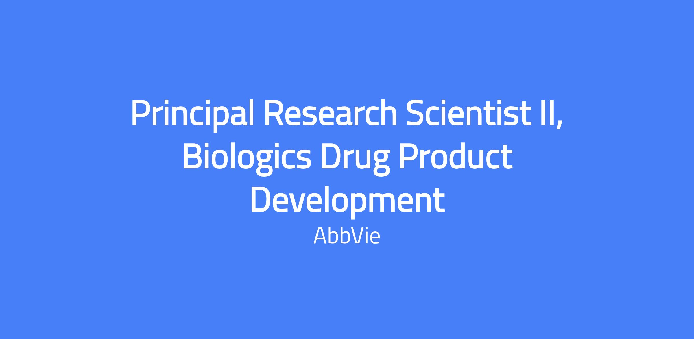 AbbVie Biologics Drug Product Development is seeking a Principal Research Scientist II, located in North Chicago, IL. The role requires a proven track record in biologics drug product process development, modeling, scale-up and tech transfer, and will be an integral part of the product development and CMC teams with collaboration across discovery research, analytical R&D, bioprocess development, and external manufacturers.
