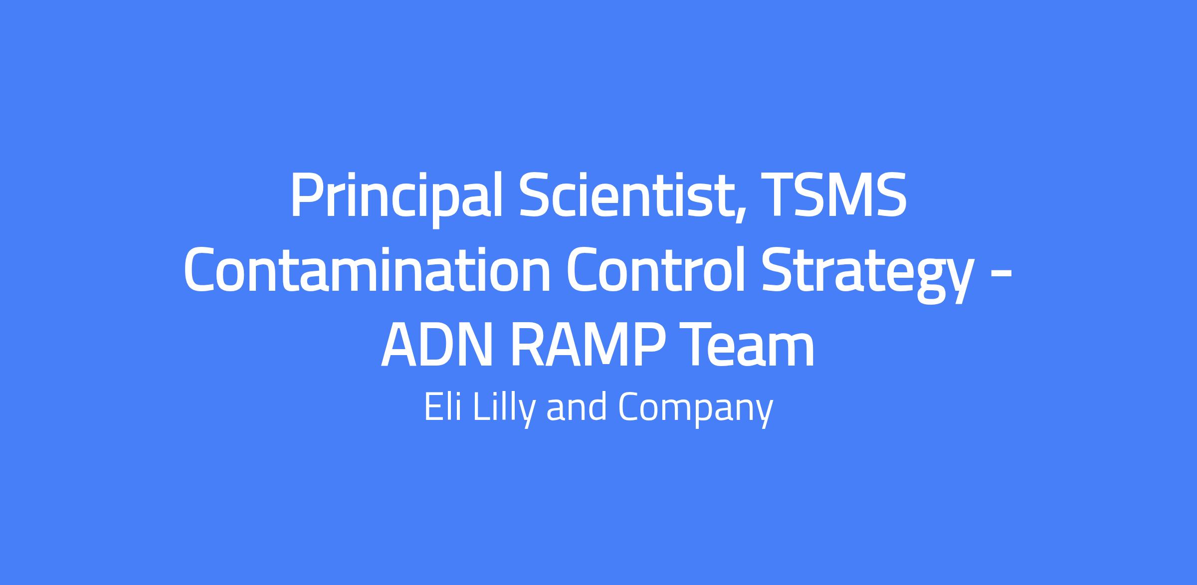 Principal Scientist, TSMS Contamination Control Strategy - ADN RAMP Team. Responsible for developing, implementing and monitoring the Contamination Control Strategy for new site facilities, coordinating with cross-functional teams to support site startups, and coaching local CCS teams to readiness for full operation.