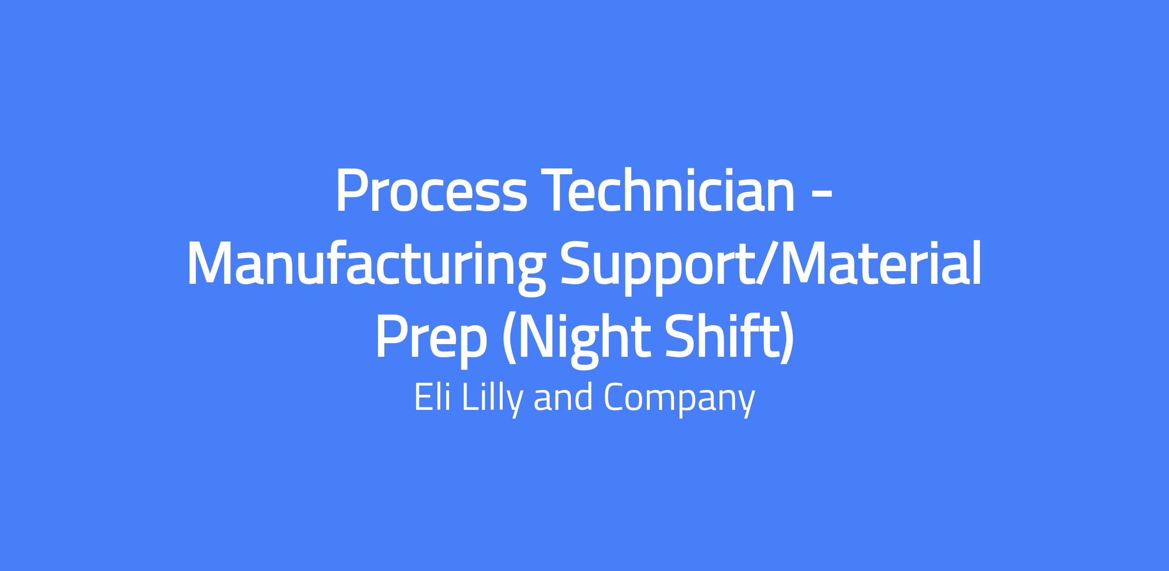 Process Technician – Manufacturing Support/Material Prep (Night Shift). Role supports filling, dispensing, and formulation processes by performing material preparation and executing daily tasks as directed by the shift lead or supervisor. Location: Lilly Research Triangle Park (RTP). Night shift schedule: 1800–0630 (2-2-3).