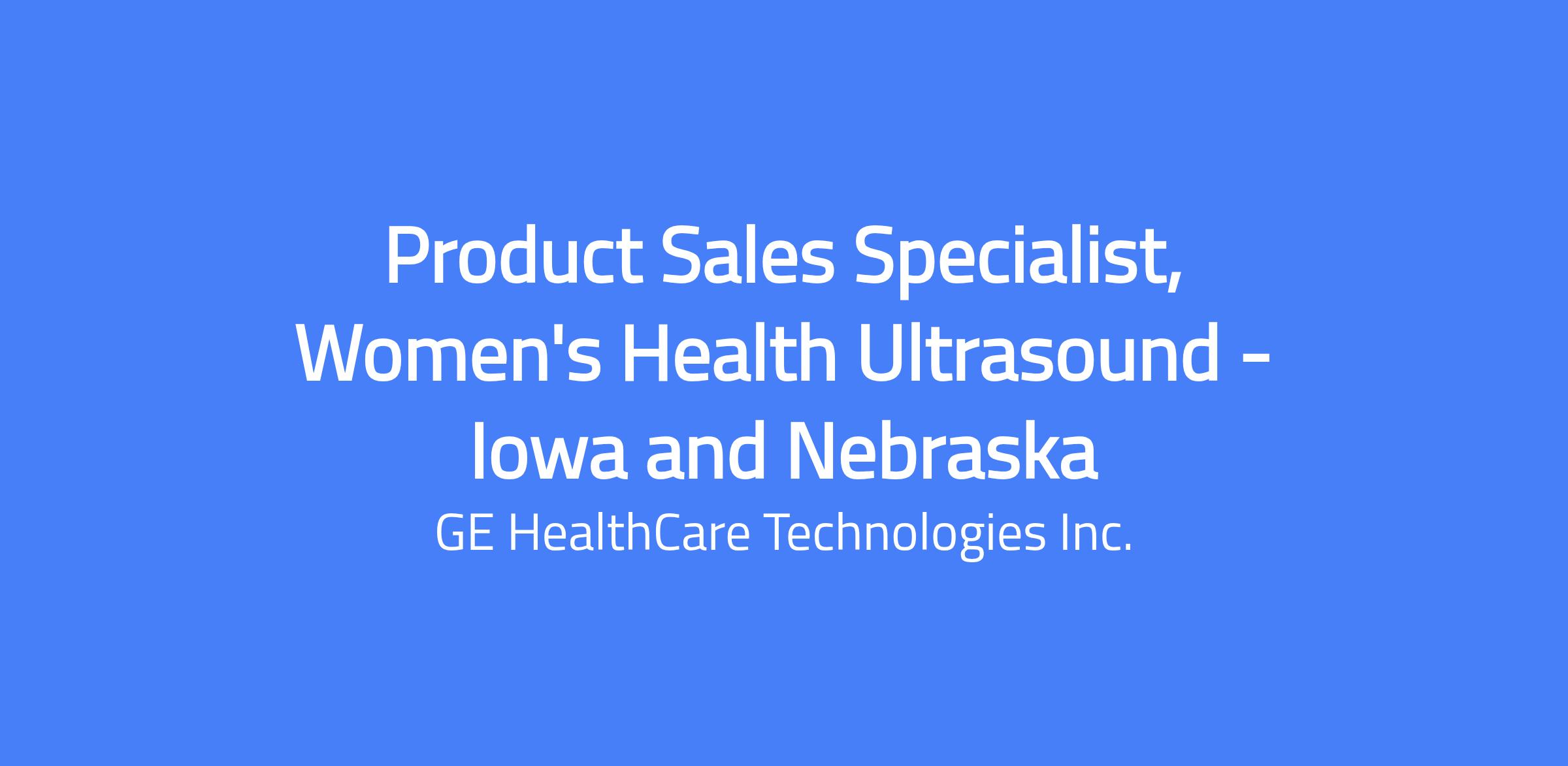 Job Description Summary As the Product Sales Specialist for Womenâs Health Ultrasound (WH), you will be responsible for selling GE HealthCare WH products and/or services to our healthcare partners. You will partner with existing accounts including large, complex, strategic, or tactically important accounts. Specialized knowledge in breadth and/or depth, as well sales experience as an expert in the field will be necessary to execute the job. GE HealthCare is a leading global medical technology and digital solutions innovator. Our purpose is to create a world where healthcare has no limits. Unlock your ambition, turn ideas into world-changing realities, and join an organization where every voice makes a difference, and every difference builds a healthier world. Job Description Responsibilities Generating proposals, preparing sales quotations and presentations, planning customer meetings, and demonstrating equipment capabilities on Womenâs Health Ultrasound (WH) products in assigned territory.⯠Maintaining satisfactory after-sale relationships. â¯Penetrating competitive accounts and communicating current market intelligence back to the business, along with field concerns, issues and requirements.⯠Providing leadership in market analysis and development/execution of strategies and action plans to drive WH Ultrasound sales. ⯠Prospecting for new customers and business in addition to growing and maintaining our existing customer portfolio. Annual and quarterly achievement of multiple sales and revenue targets.⯠Development of long-term customer relationships coupled with the ability to identify and capitalize on opportunities that immediately satisfy customer needs. Qualifications Bachelors Degree & 3 years of relevant experience; OR High School Diploma/GED & 6 years of experience; OR Bachelors Degree & a graduate of GE HealthCare CLP Demonstrated experience presenting complex information both verbally and written to decision makers. Must live in the territory and be willing to travel within the territory. (Territory: Iowa, Nebraska and Southern MN) Desired Characteristics Womenâs Health sales experience, Ultrasound clinical application and/or product knowledge⯠Demonstrated ability to work independently as well as with a team⯠Capital equipment sales experience Healthcare sales experience. ⯠#LI-AK4 #LI-Remote We will not sponsor individuals for employment visas, now or in the future, for this job opening. GE HealthCare offers a great work environment, professional development, challenging careers, and competitive compensation. GE HealthCare is an Equal Opportunity Employer. Employment decisions are made without regard to race, color, religion, national or ethnic origin, sex, sexual orientation, gender identity or expression, age, disability, protected veteran status or other characteristics protected by law. GE HealthCare will only employ those who are legally authorized to work in the United States for this opening. Any offer of employment is conditioned upon the successful completion of a drug screen (as applicable). While GE HealthCare does not currently require U.S. employees to be vaccinated against COVID-19, some GE HealthCare customers have vaccination mandates that may apply to certain GE HealthCare employees. Relocation Assistance Provided: Yes At GE HealthCare, we see possibilities through innovation. Weâre partnering with our customers to fulfill healthcareâs greatest potential through groundbreaking medical technology, intelligent devices, and care solutions. Better tools enabling better patient care. Together, we are not only building a healthier future but living our purpose to create a world where healthcare has no limits.