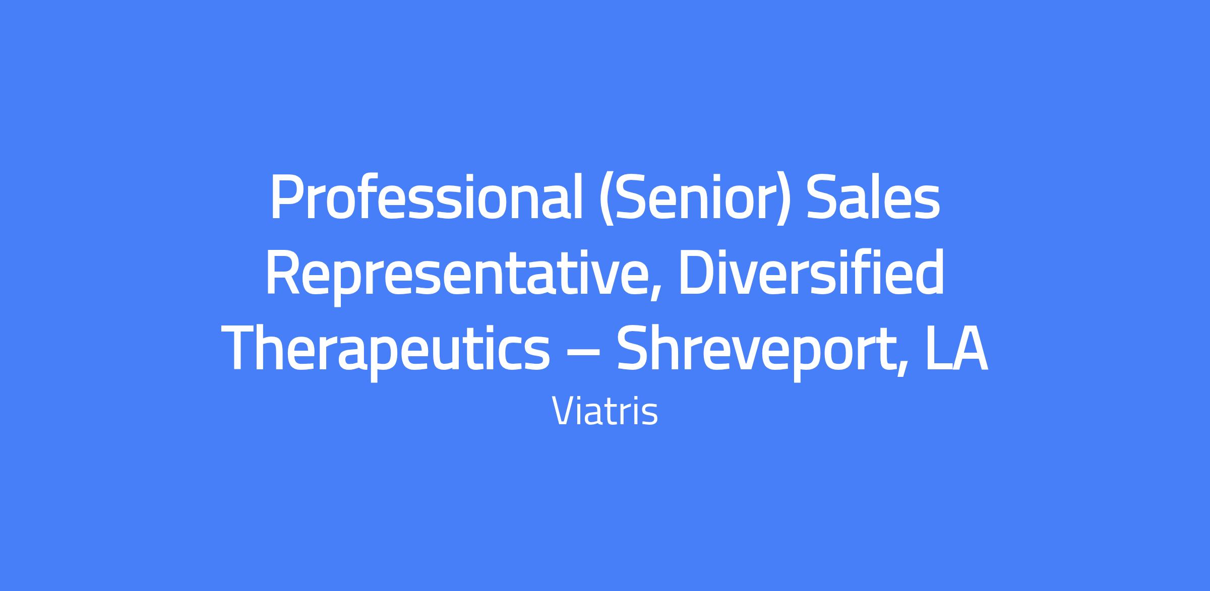 Professional (Senior) Sales Representative, Diversified Therapeutics β Shreveport, LA is responsible for driving sales in the Shreveport, LA territory by promoting Viatris products to OB-GYNs, Nurse Practitioners, Physician Assistants and Pharmacists. The role requires developing and continually improving a territory management plan based on real-world feedback, and executing pre- and post-call planning for key targets. It also involves leveraging available assets to raise healthcare professional awareness, achieving sales goals while maintaining ethical practices and regulatory compliance, and gathering customer insights to inform territory strategies.