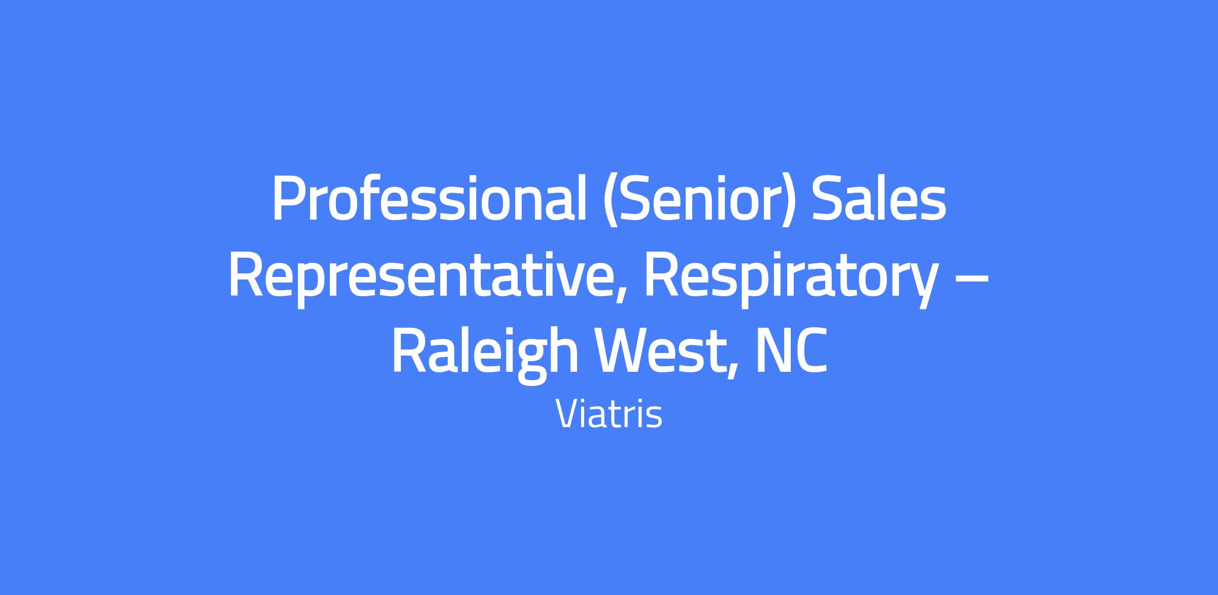 Professional (Senior) Sales Representative, Respiratory β Raleigh West, NC. In this role, you will drive respiratory product sales in the Raleigh West territory by developing and executing a territory business plan aligned with Viatris sales objectives, delivering quality presentations to targeted customers, and achieving quarterly sales goals while adhering to ethical practices and regulations. You will build and maintain productive relationships with peers, customers, and company managers, gather market information to inform strategy, and pursue continuous learning and product knowledge training.