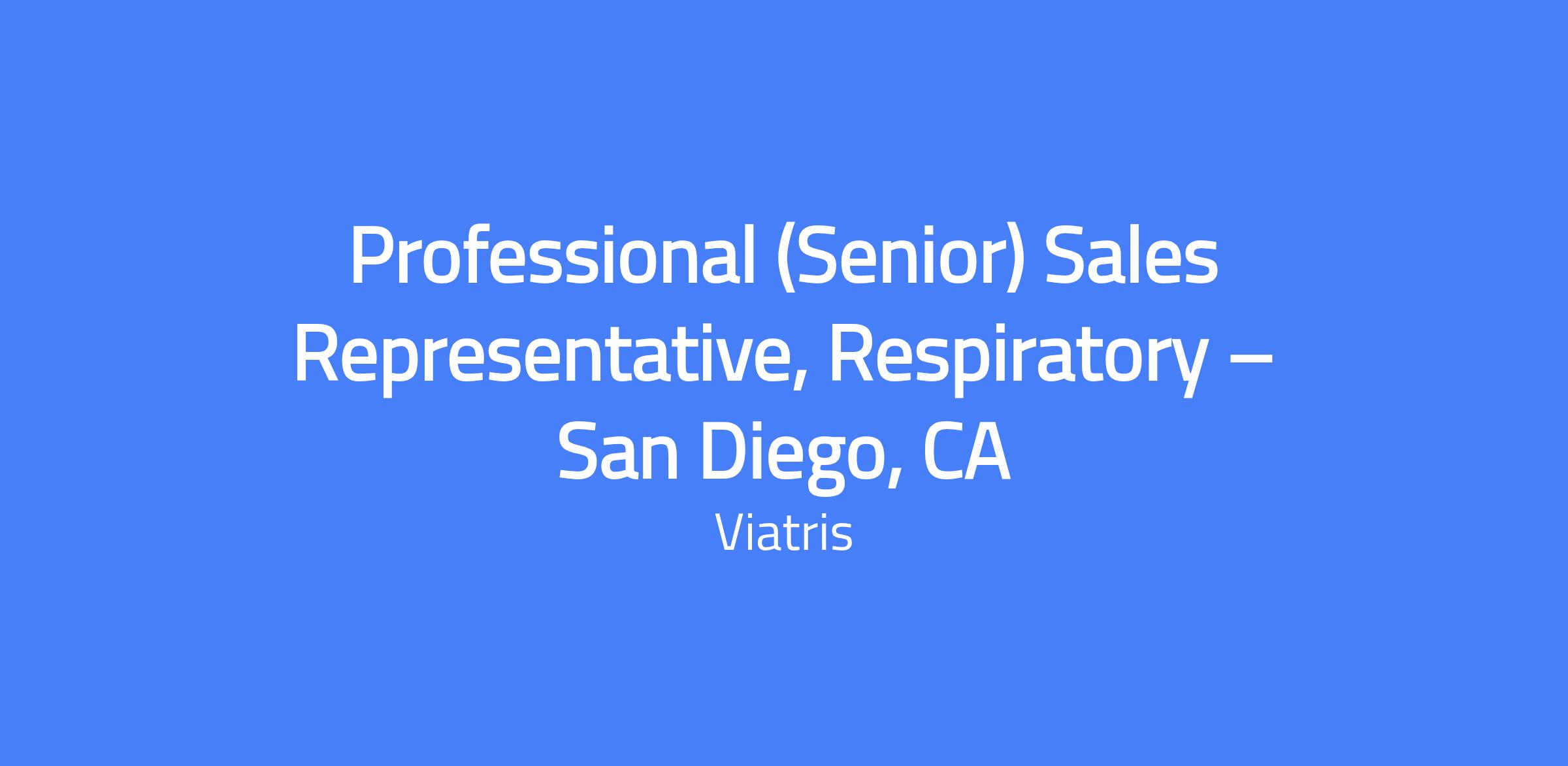 The Senior Professional Sales Representative, Respiratory for the San Diego, CA territory, is responsible for developing territory plans, delivering targeted sales presentations, achieving quarterly sales goals, and building productive relationships with customers and peers while adhering to ethical sales practices.