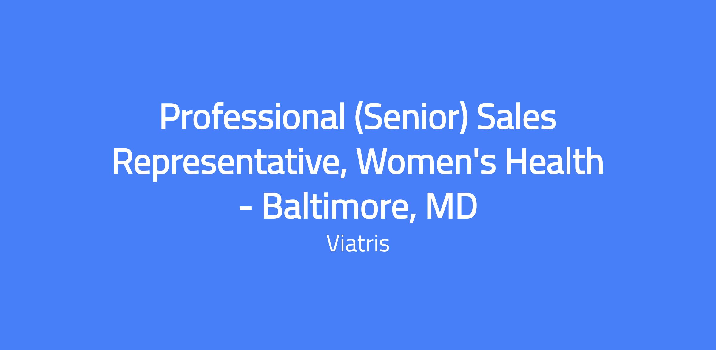 Senior Sales Representative, Women's Health in Baltimore, MD. Responsible for developing and executing a territory business plan, delivering quality sales presentations to targeted customers, and achieving quarterly sales goals while upholding ethical sales practices. This role focuses on building positive relationships with physicians, offices, and internal stakeholders to drive Viatris products in the women's health portfolio.